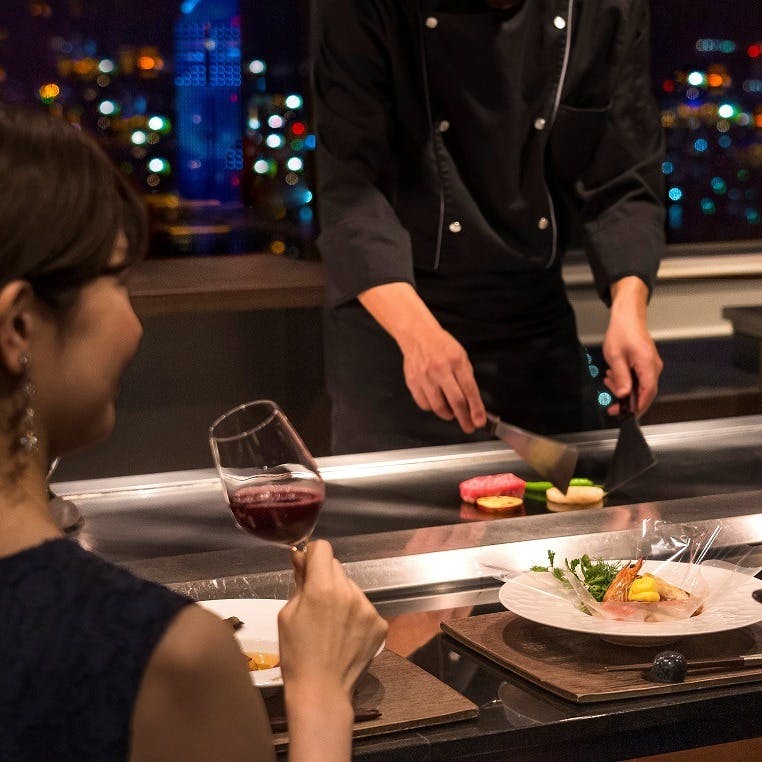 地上123mからの景色を眺めながら、新鮮な魚介類や牛肉を鉄板焼で