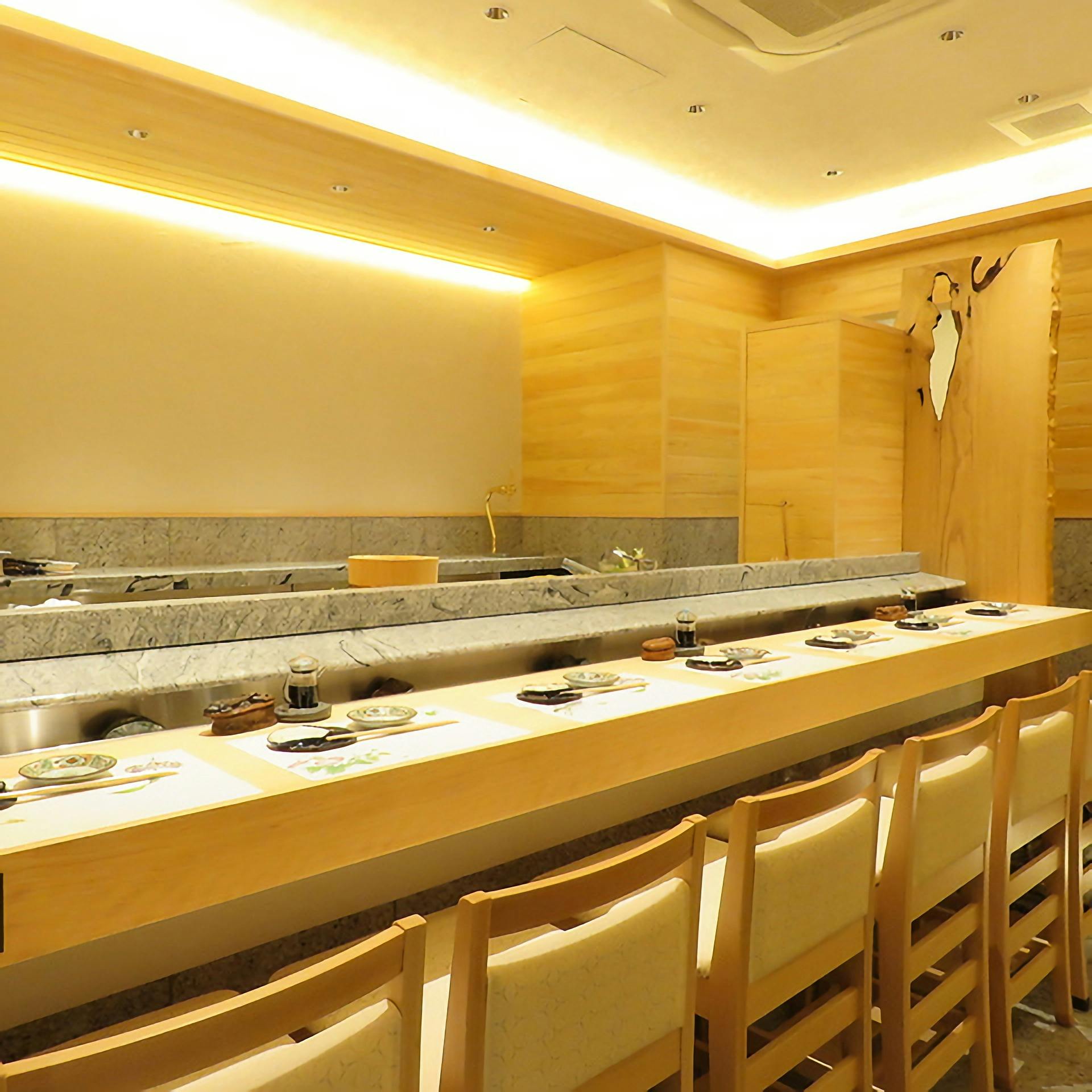 桧の一枚板が目を引く清潔感のある店内でお客様をおもてなしいたします。カウンターテーブルには、指先を洗える小さな滝が流れており、手を清潔な状態に保ち鮓を愉しんで頂けるのも当店の特徴です。素材のおいしさを最大限に味わって頂けるよう手間暇かけてお料理をご提供しております。本まぐろ・トロとうにの食べ比べが自慢の当店では、それぞれ種類の産地に徹底してこだわり仕入れております。その時期の一番旬なものを各産地・各種類ごとに仕入れており、贅沢な食べ比べをより良く提供しております。冬場には、中々お目にかかれない大間の本まぐろも必ず仕入れております。極上の食べ比べを当店で是非お愉しみ下さい。