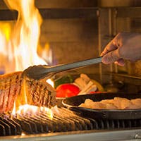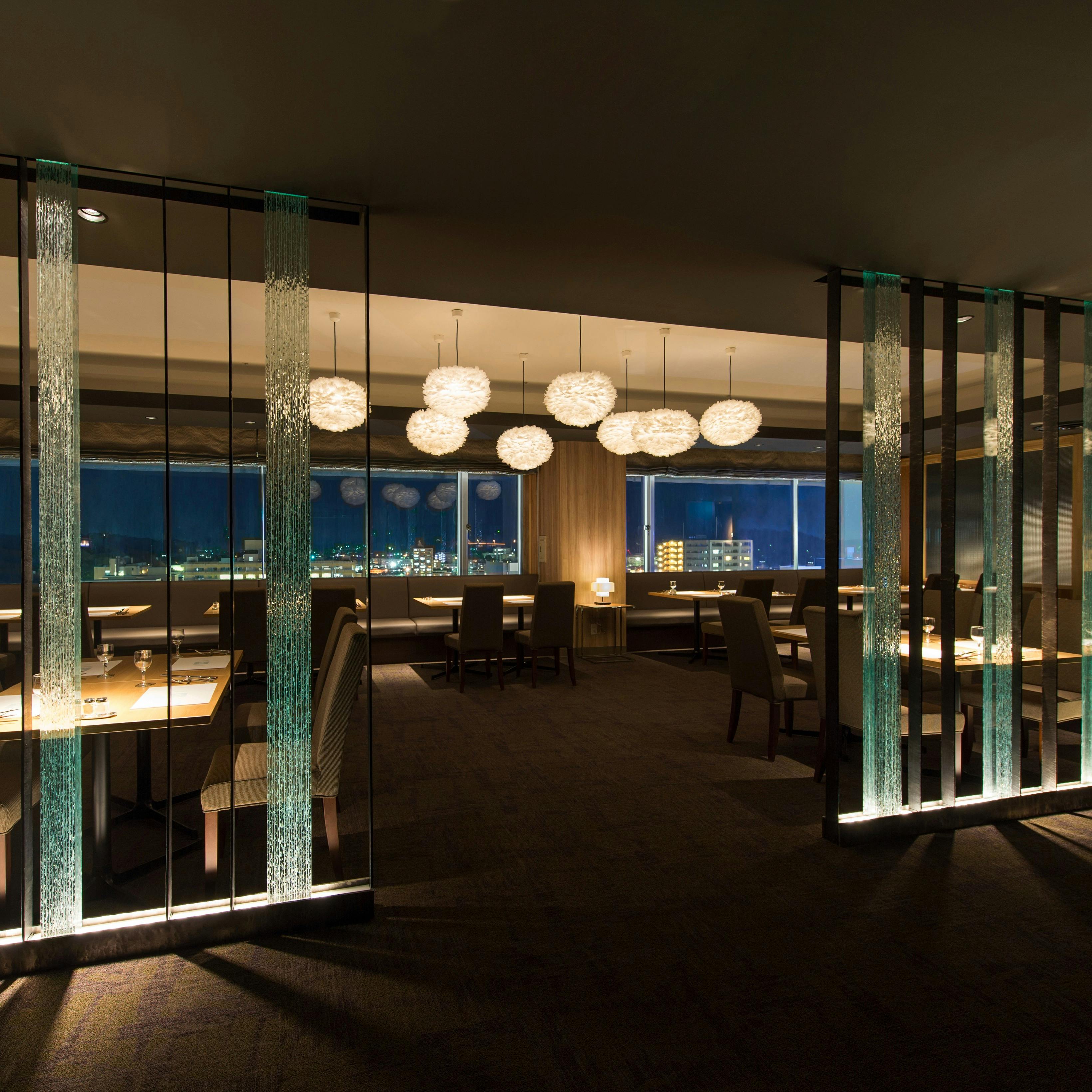 お客様の目の前で調理する躍動感ある「炎のライブキッチン」。できたての料理を前菜をはじめ、遠赤外線でふっくらと焼き上げたグリル料理や本格石釜のピッツァ、新感覚のサラダ、色とりどりの華やかなデザートまで、豊富なメニューを地上50メートルの眺望とともにお楽しみいただけます。こだわりのドリンクメニューも充実。ナチュラルな色調で統一された店内は優しく落ち着きのある空間です。大切な方との会食におすすめの会席コース料理もございます。