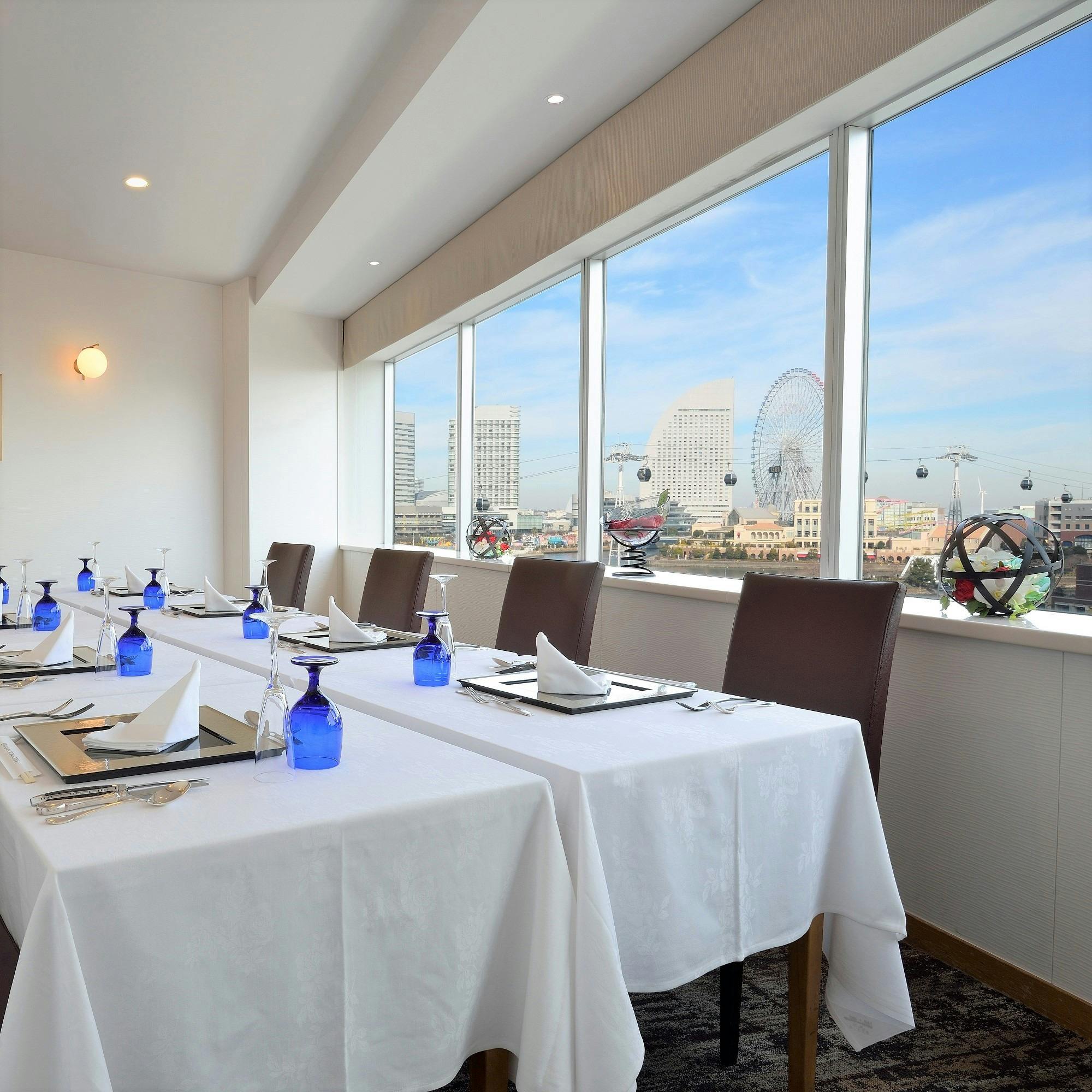 桜木町駅前「横浜桜木町ワシントンホテル」5階のレストラン。大きな窓から臨むみなとみらいの景色とともに、シェフ自慢のお料理をお楽しみください。時間制限なくゆっくり味わえるランチビュッフェ、女子会や記念日にぴったりのスパークリングワイン付きコースなど、充実のラインアップ。6~200名様まで対応の個室もあり、パーティーや結婚式2次会など、様々なシーンでご利用いただけます。