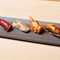 業界に旋風を巻き起こす匠系列の鮨店。その総本山、四谷「すし匠」の中澤氏のもとで18年の修業を積んだ店主、高橋 進吾氏が青山に構えた「匠 進吾」。「すし匠」でお馴染みの一品料理を交えたおまかせコースはもちろんここでも健在。赤酢と米酢の2種類のシャリを使い分け、 ネタの持ち味の引き出し方にもメリハリをつける鮨。食べ手の箸の進み具合に合わせて握る絶妙な間合い。さらに鮨の合間に供される一品料理でアクセントや変化を加え、緩急自在の味とリズムで心地よい食の時間を演出します。また宮城・石巻の酒蔵で修業を積んだ経験を持つ店主が厳選した日本酒をお食事と共にお愉しみください。