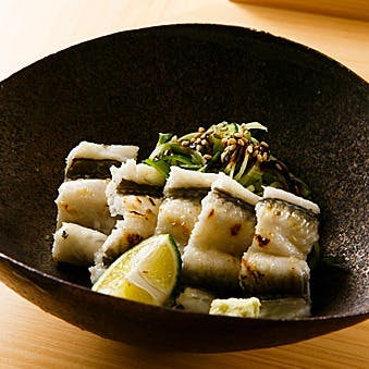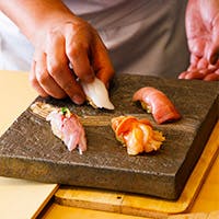 新富町駅1分。職人歴30余年の大将が熟練の技で握る本格江戸前寿司。四季折々の新鮮な旬のネタは毎日豊洲から仕入れ、江戸前のひと手間を。こだわりの赤酢のシャリと一体となった鮨の旨味を存分にご堪能下さい。旬の素材を活かした一品料理も多数ご用意しています。店内は桧のカウンターと6名用半個室があり清潔感と温かみのある空間。ちょっと贅沢なお食事から接待やハレの日の特別な一席まで多彩なシーンでご利用頂けます。