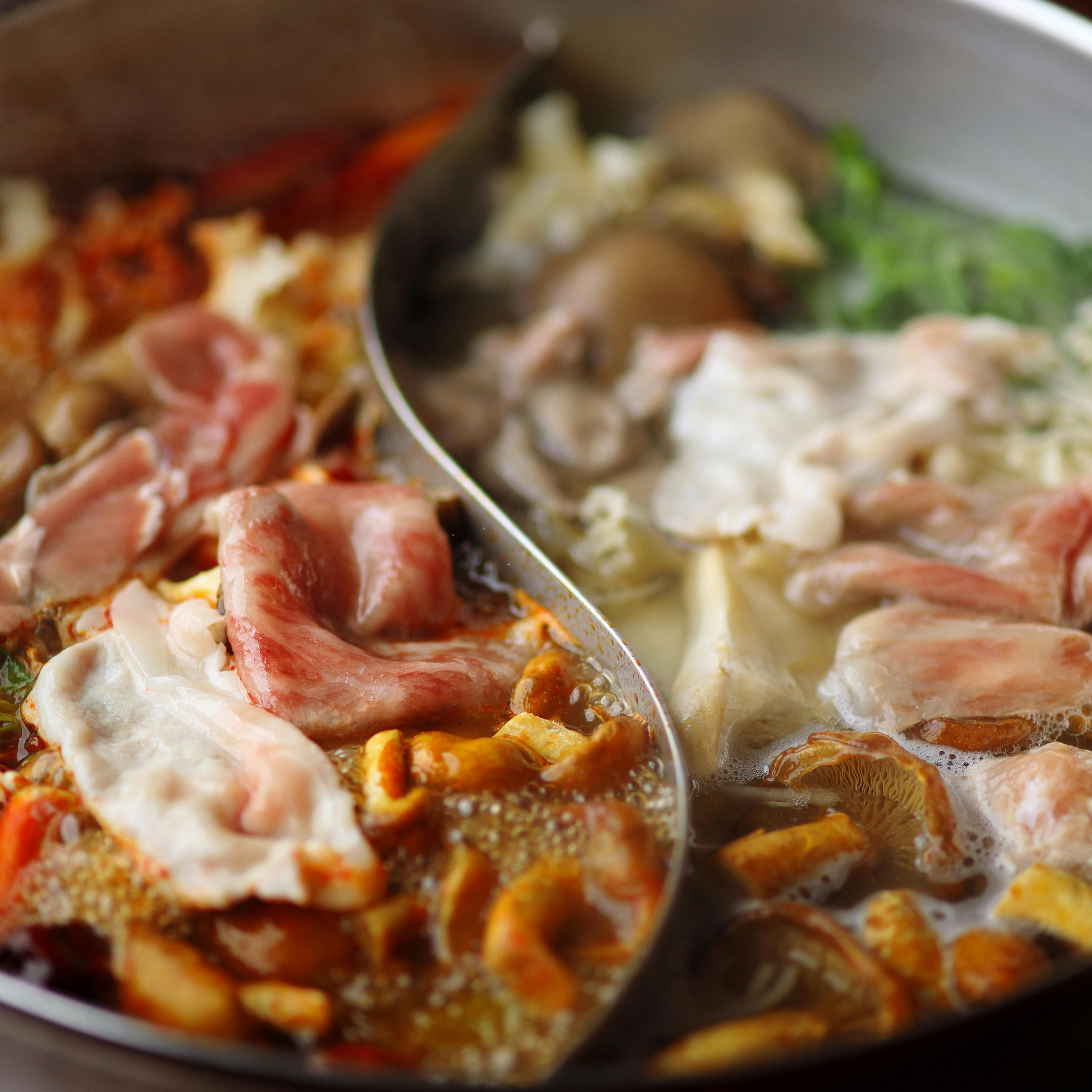 「四川発祥のしゃぶしゃぶ」 肉の臭みを消して咳込むほどに辛いスープを、素材の味を楽しめる様、程よい辛さに仕上げた四川スープと、 干し貝柱・干し海老の旨味を加味し、あっさりと上品に仕上げた北京スープを組み合わせた洗練された火鍋となっております。