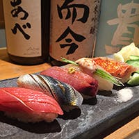 店主が毎朝築地で仕入れる旬の鮮魚を使用し、職人技で美しく丁寧に鮮度を落とさず握ります。お寿司との相性を考えて店主自ら取り揃えた季節の銘酒をご一緒に贅沢なひとときをお愉しみください。