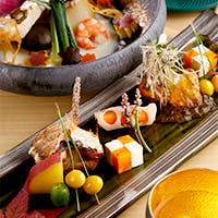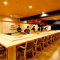 旬の色彩豊かな食材を使用し、熟練の職人が極上の一皿へと昇華させた日本料理をご堪能いただけます。大きな檜のカウンター席は、臨場感溢れる調理風や目の前で作られた出来立てのお料理を贅沢に愉しむ特等席でございます。ご接待や記念日にも大変おすすめですので、様々なシーンにご利用ください。