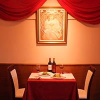 大きな通りから一本中に入った隠れ家的な店内は、アルフォンス・ミュシャの絵たちに囲まれた落ち着いた雰囲気。お一人でも気軽に楽しめるカウンター席や、ご利用にあわせてアレンジ可能なテーブル席をご用意しております。貸切も承りますので、女子会や結婚式の二次会、各種パーティーなど様々なシーンでご利用いただけますので、お気軽にお問い合わせくださいませ。
