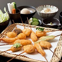 全ての素材をそのまま串に刺すのではなく、ひとつひとつの素材をあらかじめ京風の味付けに調理し、秘伝の衣を厳選された最高級のラードで さっくりと、且つ低カロリーに揚げる本格的な上方流串揚げが六波羅流です。季節に合わせた36種類の串は六波羅ならではの自家製ソース(3種)、塩山椒、カラシで心ゆくまでお楽しみ頂けます。旬の食材を生かし丹精を込めた串揚げで、時間を忘れてお食事と会話をお楽しみください。