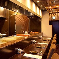 カウンターの目の前、2つの鉄板を使い、職人が手掛けるお料理の数々。A5ランクの黒毛和牛や産地直送のこだわりぬいた食材を使用し、ひとつひとつ丁寧に仕上げる逸品をお召し上がりください。特等席は技の数々を眺めながら愉しめるL字のカウンター、そのほか洗練された個室もご用意しております。記念日のデートや接待などシーンに合わせて、極上の品々と共にゆったりとしたお時間をお過ごしください。