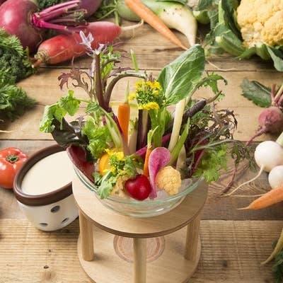 川崎駅直結のラゾーナ川崎プラザの4F。全国の契約農家さんから届く旬のお野菜・珍しいお野菜たちが自慢のお店です。特製の出汁にさっとくぐらせて食べる看板メニュー『お野菜しゃぶしゃぶ』は、まさに逸品!野菜の綺麗な色と形、食感、味わい、を堪能いただける珠玉のお野菜鍋です。厳選されたお肉とともにお野菜を食べ放題でお愉しみくださいませ。