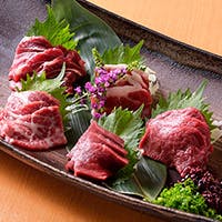 近年、“高たんぱく質、低カロリーな肉”として注目を浴びている馬肉。そんな熊本の名産品「馬肉」を名古屋で味わうことができる【桜肉料理専門店 焼馬 古閑】。専門店だからこその品揃えと、牧場直送という利点を生かし刺身・焼馬の両方をお楽しみ頂けます。日々入荷する部位がかわるので、盛り合わせに希少部位が入ることもございます。また、料理の味を引き立たせてくれるお酒は、地酒や焼酎、そしてワインに至るまで幅広いジャンルをご用意しております。豊かな自然と温暖な気候に恵まれた、より自然に近い最適な環境で育てられた馬肉を是非、ご賞味下さい。
