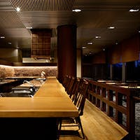 比叡の緩やかな山並みや湖面を走るさざなみなど近江の風土をモチーフにしたモダンジャパニーズの店内。割烹カウンターでライブ感を楽しみながら、出来立てのお料理をお愉しみください。