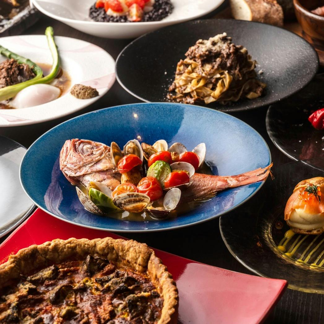 間接照明の灯りが優しく照らし出す、落ち着いた雰囲気の和風肉バルレストラン【わいんとお肉 だいせん/Hotel Kuu Kyoto】。京都駅から7分ほど歩いた街中にありながら、ゆったりとした時間が流れる心地良い空間です。肉・魚料理などのイタリアンを中心に味わえます。お酒は、全国の日本ワイン約40種類からカクテルまで充実しており、1人飲みからパーティーや女子会まで、あなた好みの使い方ができる一軒です。