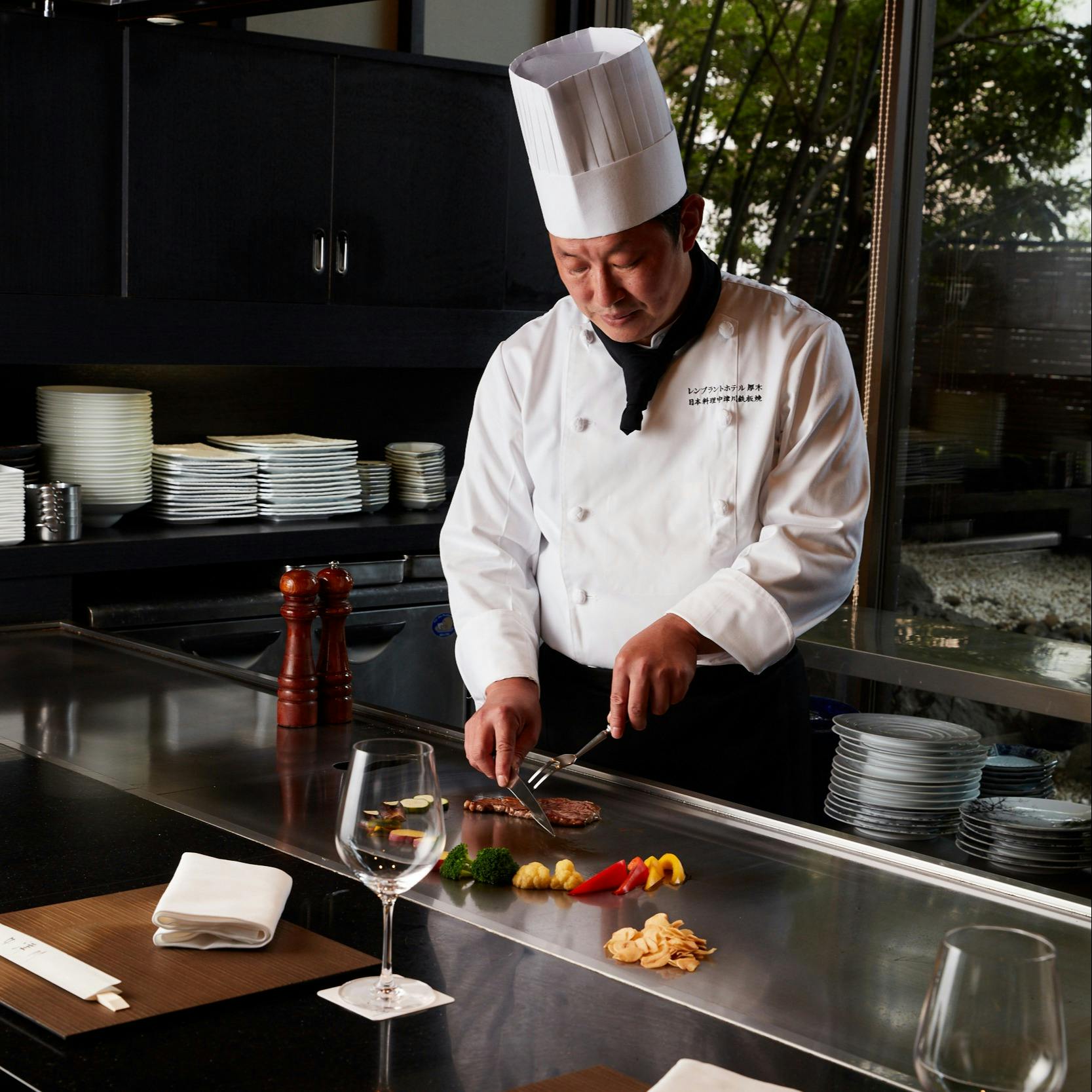 風情あふれる日本庭園を眺めながら、日本料理ならではの四季折々の旬の味覚をお楽しみいただけます。最上級黒毛和牛などの厳選食材をシェフが目の前で焼き上げる鉄板焼カウンターでは熟練の技とともに、極上の味わいをご堪能くださいませ。