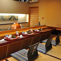 当店は、季節折々の旬の天然素材を極上の胡麻油で揚げる、天ぷら専門店です。四季の味わいを大切にし、掘りごたつになったお座敷天ぷらは、他のお席から離れてのお部屋ですので、ご家族、ご接待など、いろいろと喜ばれています。完全個室のお座敷天ぷらでは、旬の魚や野菜などを一品ずつお出ししております。季節折々の旬の天然素材を極上の胡麻油で目の前で揚げる趣向ならではの格別の味と香り。また、山海の美味の一品料理も各種ご用意しております。ぜひ当店で極上天ぷらをご賞味くださいませ。
