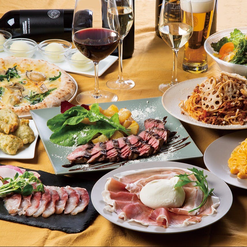 ランチはパスタやピッツァを選べるコースが人気です。 ディナーは飲み放題付きパーティーコース(4名様から、大皿で取り分けるパーティスタイル)の他にもプリフィクスコースなどご用意しております。