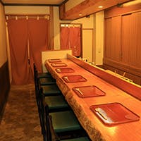 天神南駅、西鉄福岡(天神)駅より徒歩5分、博多・天神の路地裏にひっそりと佇む大人の隠れ家「むら川.」。北海道かつらの木を使用した一枚板のカウンターがお迎えします。毎朝市場で厳選した旬の食材・こだわりの黄金一番出汁を使用しております。日本料理の名店で腕を磨いた店主の味の奥行をお楽しみください。