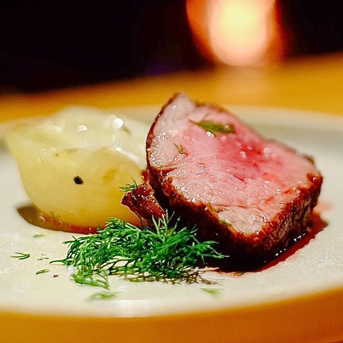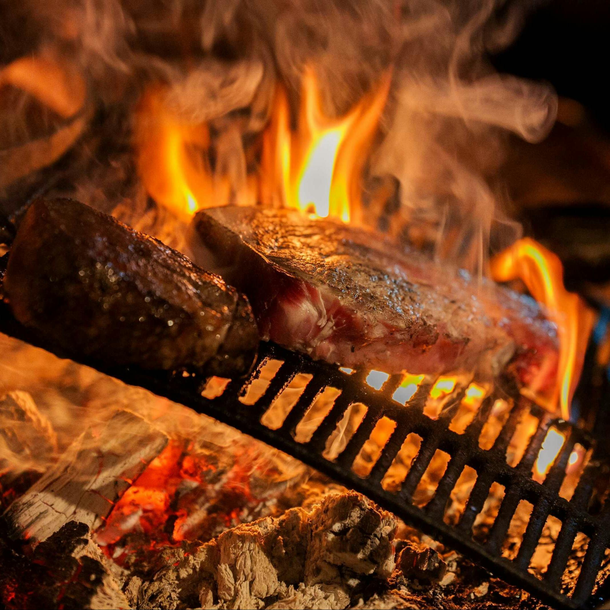 当店のテーマは「キャンプ」。コの字型のカウンターの中央には焼き台では焚火がたかれており、牛・豚・鶏、話題のジビエなど、さまざまなお肉を薪で焼き上げます。斬新なスタイルの当店は、各種メディアでも取り上げられています。皆様のご来店お待ちしております。