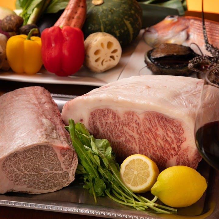 旬の魚介類や極上の和牛、旬の野菜までを目の前で豪快に調理。