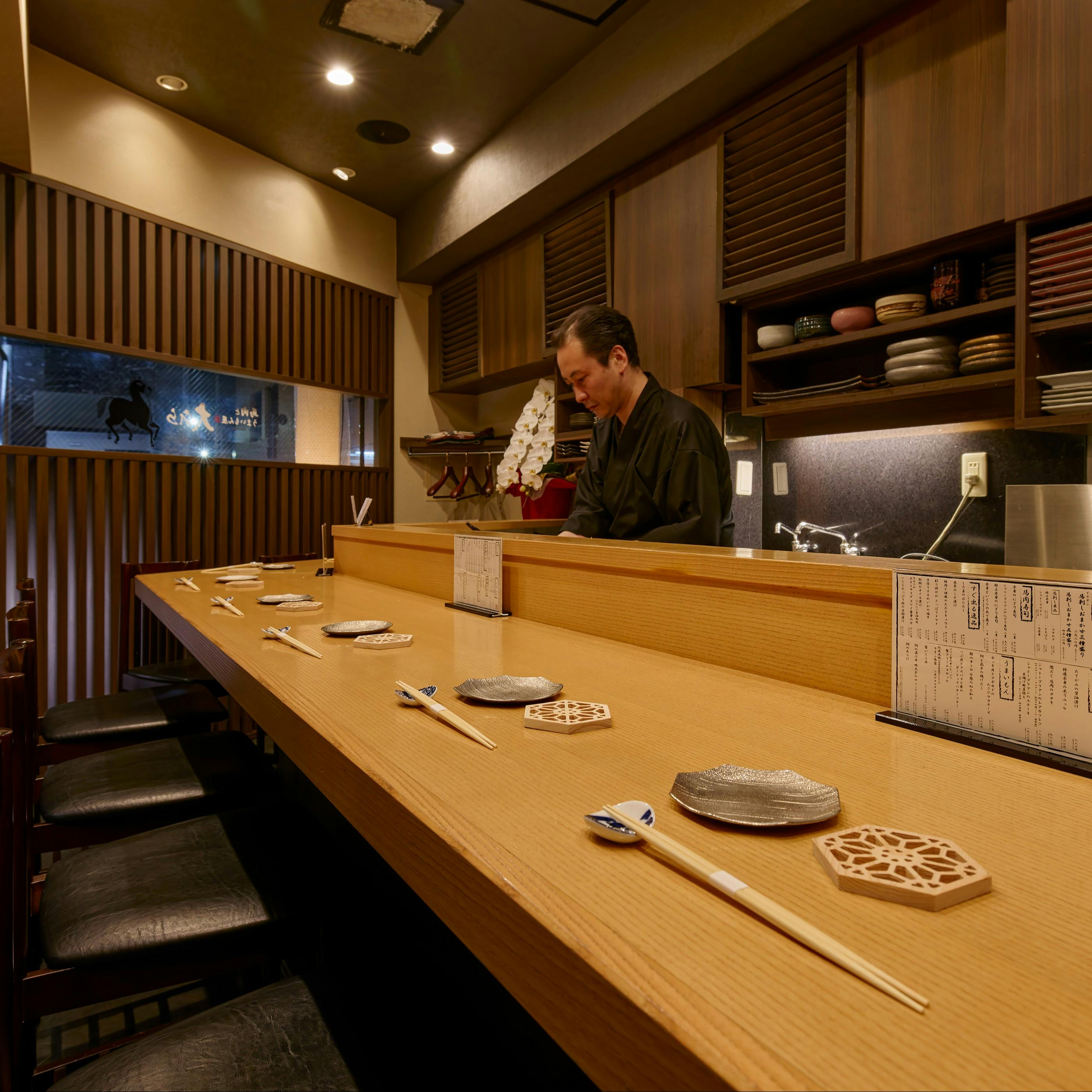 落ち着いた照明の高級感漂うカウンター席。和食の料理人が1つ1つ丁寧に仕上げる料理は、手頃な価格ながらも どれもが本格的。お一人でもフラッと立ち寄れるよう、馬刺し単品・寿司一貫からご注文を受けております。 気さくな店主ですので、リラックスしてお食事とお酒をお楽しみください。