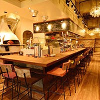 橋本駅から徒歩1分のアクセス良好な場所に位置するイタリア料理レストラン【サントフエゴ 橋本】。半地下への階段を降りると異国情緒あふれる空間が広がり、まるでイタリアの路地裏に来たかのような雰囲気です。ワイングラスのシャンデリアが煌びやかな店内は女性に人気のオシャレ空間。 イタリアから取り寄せた「アクントナポリ」の薪釜で焼き上げたピッツァはもちろん、パスタや前菜などバルならではの豊富なメニューをご用意しております。是非、本格イタリアンをお楽しみください。