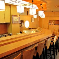 高級感を感じられる店内には、迫力のあるカウンター席とゆったりとできる小あがり席がございます。カウンター席では、料理人との会話を楽しみながら調理を間近でご覧いただけます。ご接待や会食など様々なシーンでご利用ください。