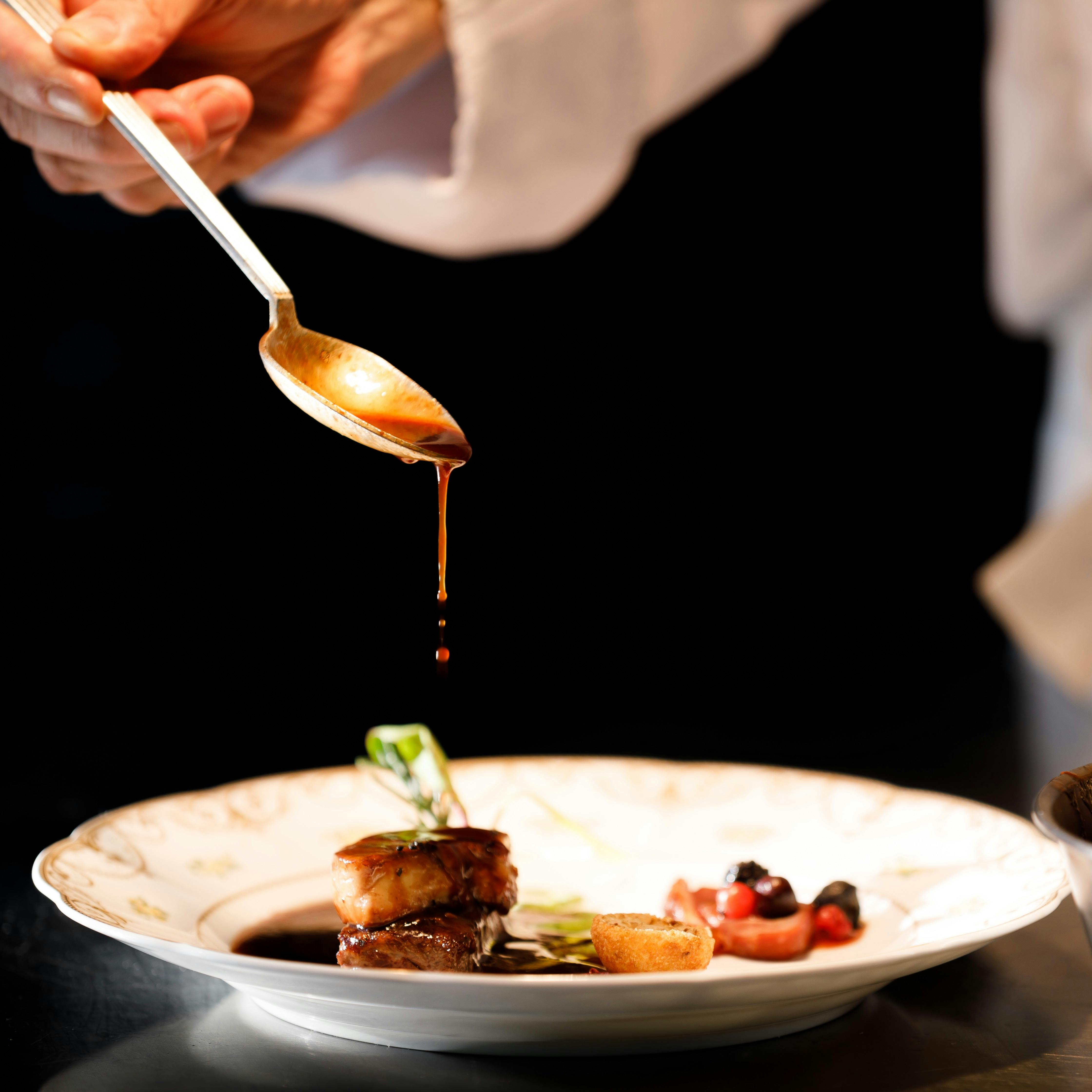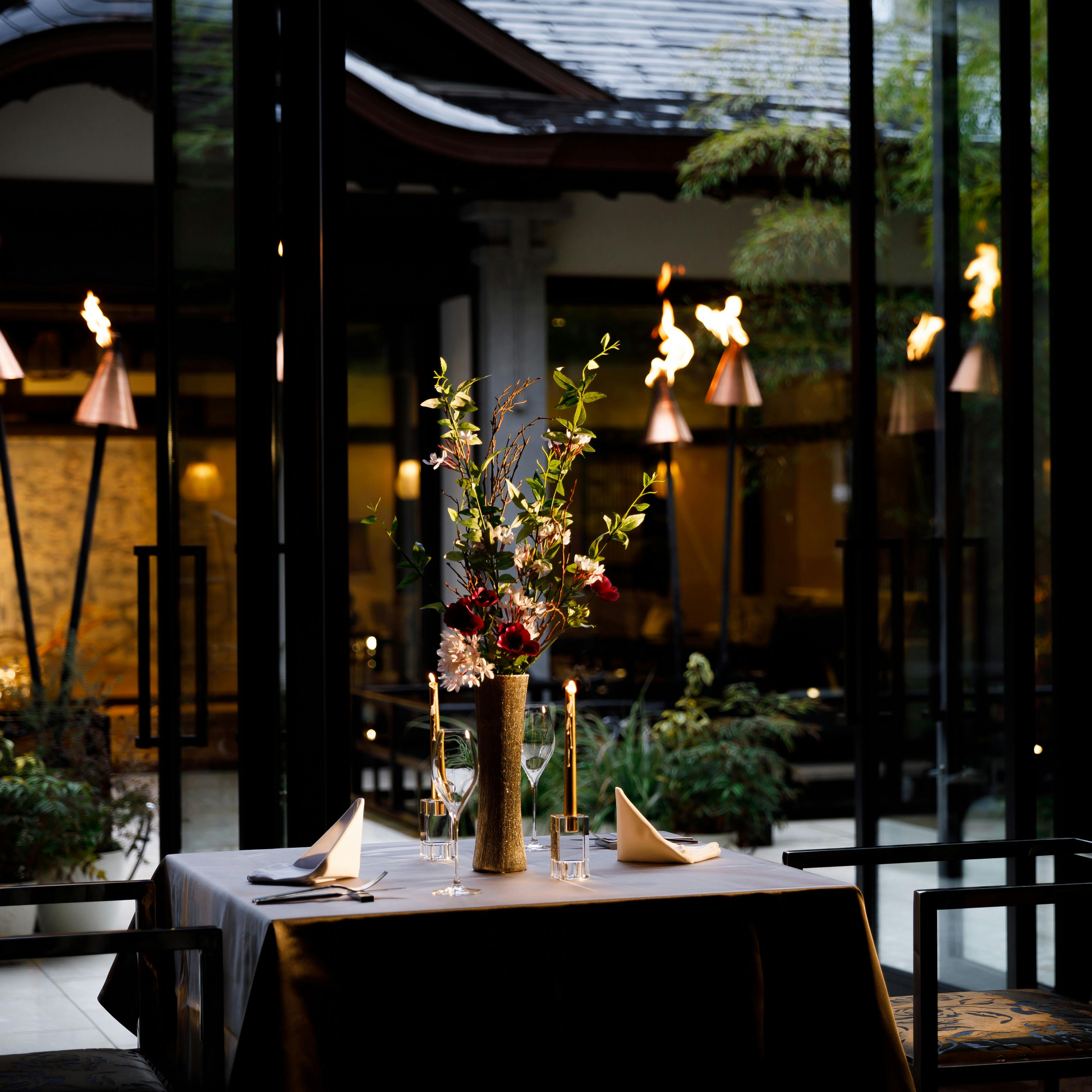 伝統的な日本の装飾を取り入れた洗練された空間で、四季折々の旬の厳選食材を使用し、目にも美しく彩り鮮やかな料理の品々をお愉しみいただけます。フランスに渡り、星付きレストランで腕を磨き上げたシェフのひと皿は、料理に想いを込めた華やかなおもてなしの象徴でございます。吹き抜ける風、竹林に差し込む穏やかな陽光、幻想的な松明の炎…。清らかな水音を湛えた日常にない寛ぎと癒しに身を委ね、大切な方との雅な時間をお過ごし下さい。