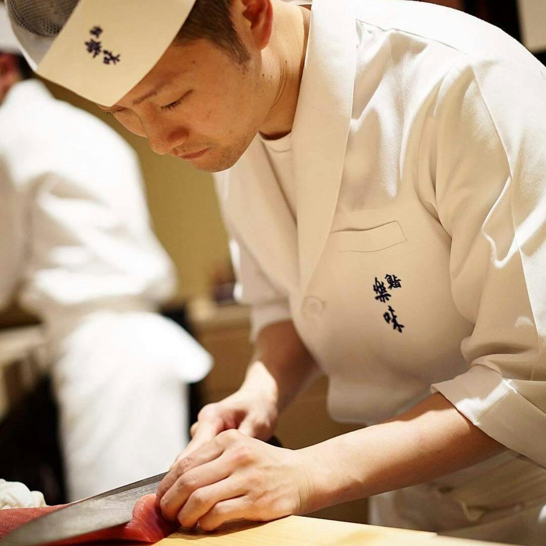 祇園北側にある白川沿いに佇む【鮨 楽味】。京だしを大切にした和食と京都・豊洲・焼津より仕入れた旬の魚を使った江戸前鮨の魅力が感じられます。8席の美しい尾州桧からなるカウンターの前では名店で技法を習得した握り手が赤酢、白酢の2種類を巧みに使い分け、鮨本来の味を楽しむことができる「お任せコース」をご用意しております。ぜひこの機会にご賞味ください。