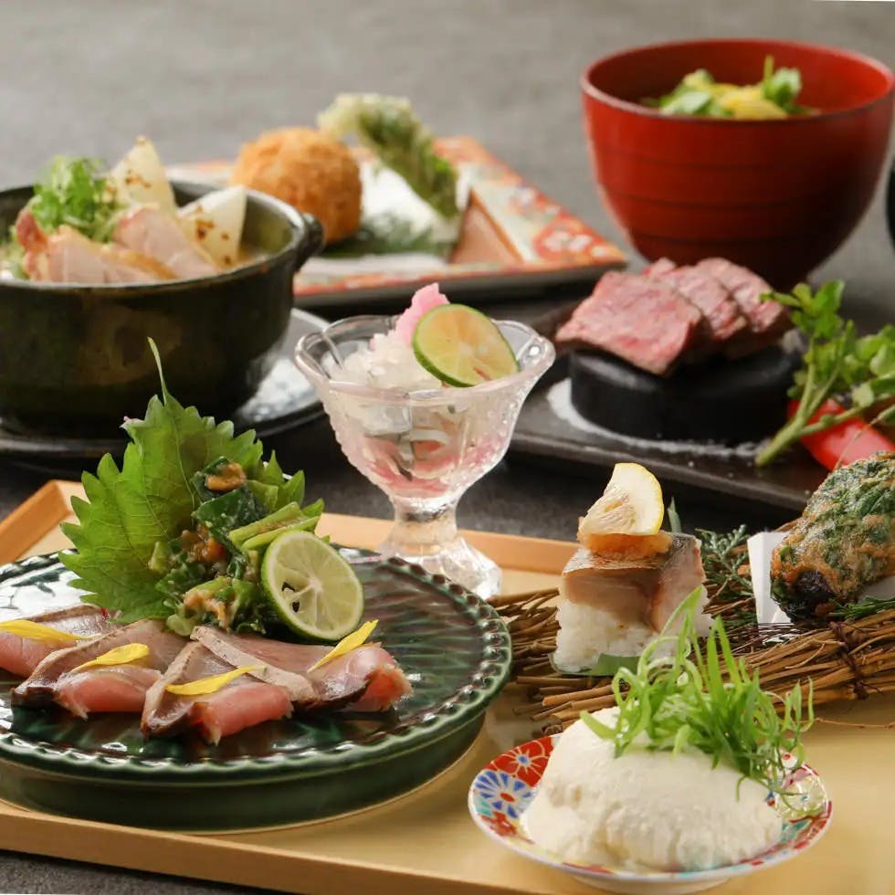 優雅で落ち着いたプライベート空間で、厳選素材を職人が腕をふるっておもてなし。大切な方との接待やお顔合わせ、誕生日や記念日など幅広いシーンでご利用いただいております。大阪駅、梅田駅から好アクセスで集まりやすくお昼からの同窓会にも最適です。全国各地から仕入れる最高級食材を自慢のコースやアラカルトと“お料理を引き立てる美酒”で至福のひと時をご提供いたします。各利用シーンに合わせたテーブルタイプと掘り炬燵タイプの大小個室も完備、天高13Mの開放感あるメインダイニングでは最大64名様までの貸切も可能です。