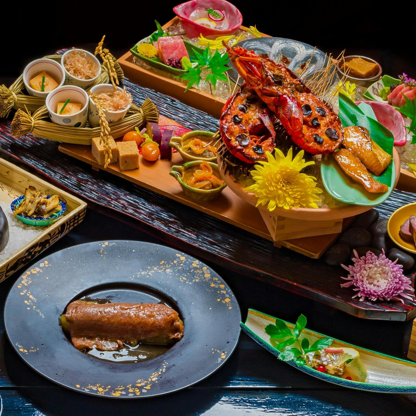 季節に合わせて変わる献立は、食材そのものだけではなく器やあしらいを含めて、料理を演出致します。特に八寸や前菜は盛り付けにも物語を持たせ、目でも味わえるよう趣向を凝らしております。地産のブランド牛や野菜、近海物の海産物、その年最も出来の良い米、などなど。当館で提供する食材は、地元をはじめ全国の協力業者と提携し、職人が厳選した本当に美味しい食材を提供致します。