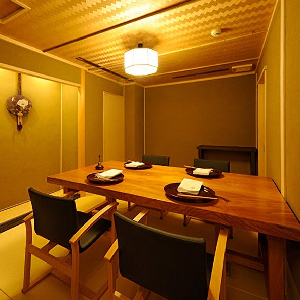 大阪、京都の人気店で修業をした金沢出身の店主。魚は9割金沢から仕入れ、季節に応じて旬ものを取り揃えております。カウンターは栓の一枚板を使用し、重厚な造りとなっております。店内は靴を脱いで、寛げる畳敷きとなっておりますので、ごゆっくりおくつろぎいただける空間です。コースはその日の旬の食材を使用した店主お任せコースのみのご提供。四季折々の旬と真心を纏った逸品をご堪能ください。