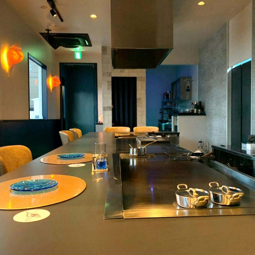 店内デザインコンセプトは「もし竜宮城にステーキハウスがあったら」。大きな貝殻の照明に、目の前に設置してある鉄板が印象的な店内。シェフの華麗な手捌きをお楽しみ下さい。神戸牛、松阪牛、近江牛、旬の野菜や新鮮な魚介をご用意してお待ちしております。
