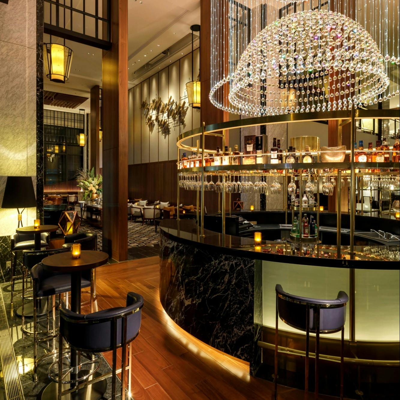 吹き抜けと巨大なシャンデリアが目を惹くバー&ラウンジ