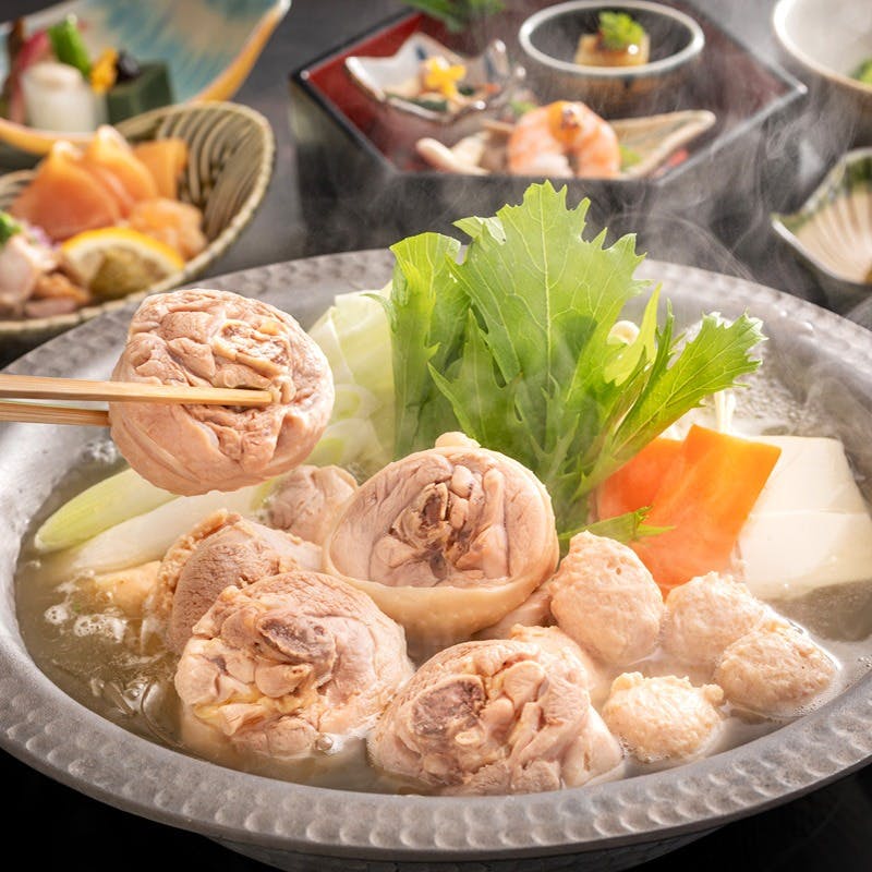 博多で生まれ、博多で育まれた味、水たき。当店は北部九州で自ら育てた銘柄鶏「華味鳥」を使用した、こだわりの水たきをご提供しております。濃厚な鶏ガラスープは具材を煮込むほどに旨味が溶け出し、より滋味深い味わいへと変化してまいります。また、水たきに欠かせないぽん酢も、華味鳥の水たきに合うように作られたものです。ぜひご賞味ください。