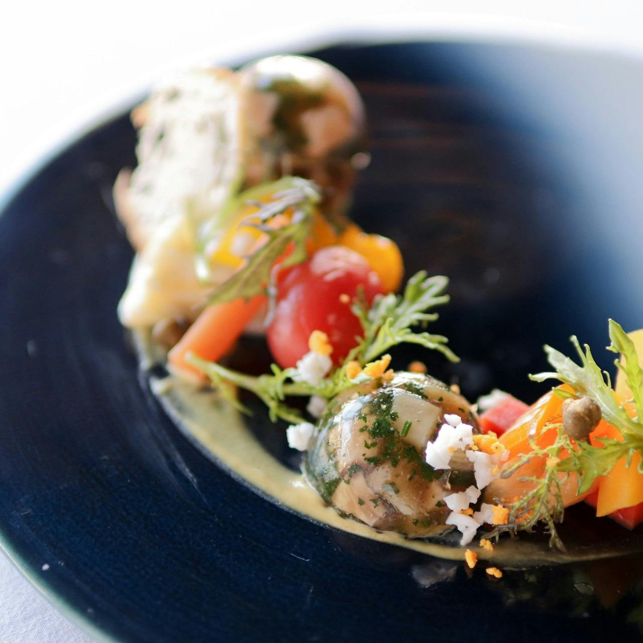 瀬戸内海の海の幸、自然豊かな山々の幸、そこから流れる清らかな肱川の川の幸。恵まれた自然地形から生み出される数々の愛媛、大洲の美食。そして元文五年に書写されたとされる大洲藩の地誌「大洲秘録」に記される大洲藩の江戸時代からの名産品。そんな数々の食の宝にフレンチの技法で魅力を引き出し、和でも洋でもないイノベイティブフュージョン料理として仕上げます。
