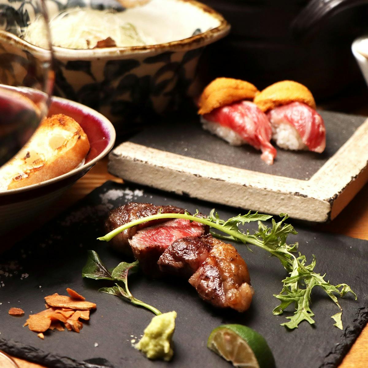 成城学園前駅からほど近く、地下への階段を降りるとひっそりと隠れ家の様に佇む「いちぼ」。旨味の濃い赤身肉、新鮮な魚介、力強い野菜を様々な技法を駆使し、居心地の良い空間造りを目指しております。お一人様、接待、ご友人との会食など、さまざまな用途に、ご利用いただけます。皆様のご来店をお待ちしております。
