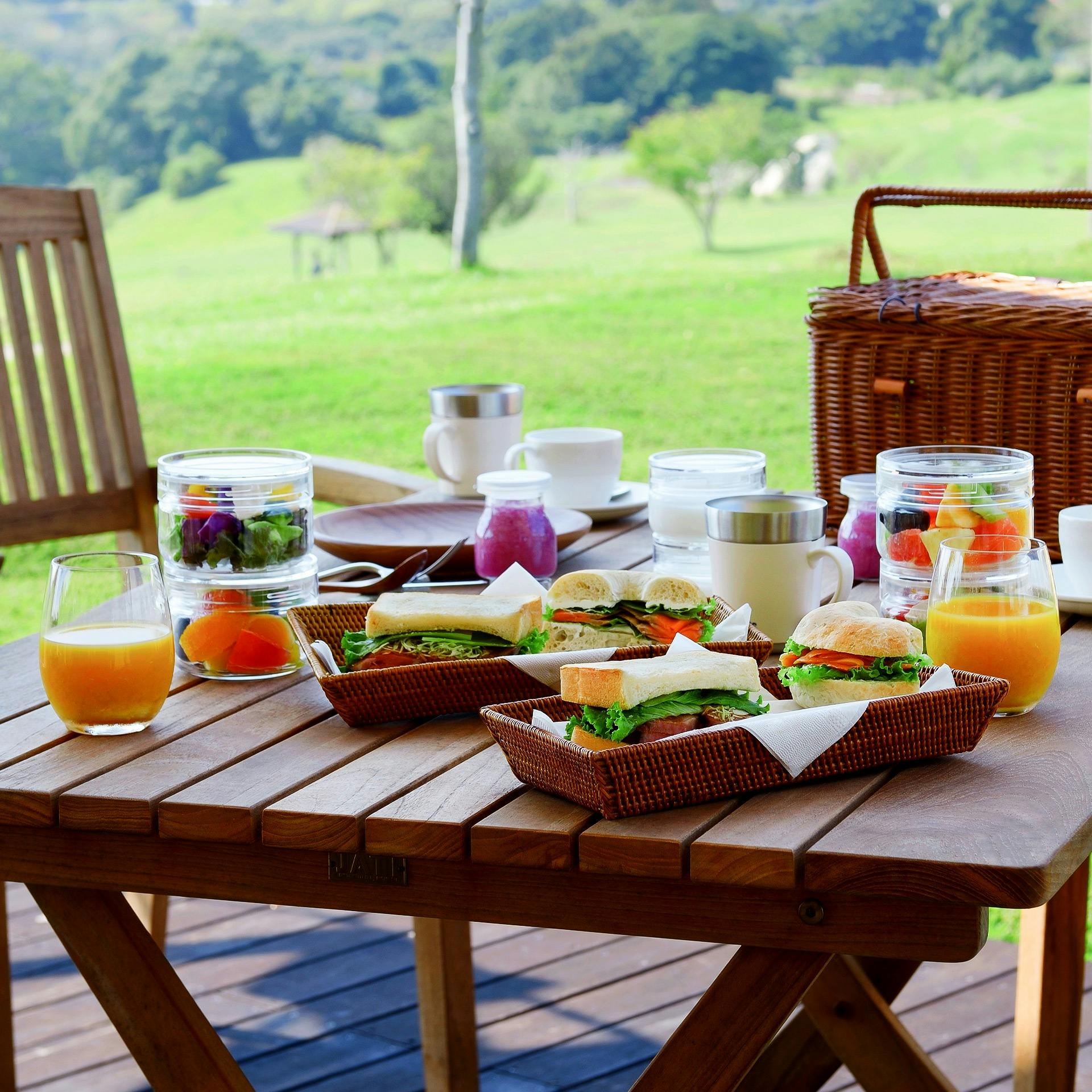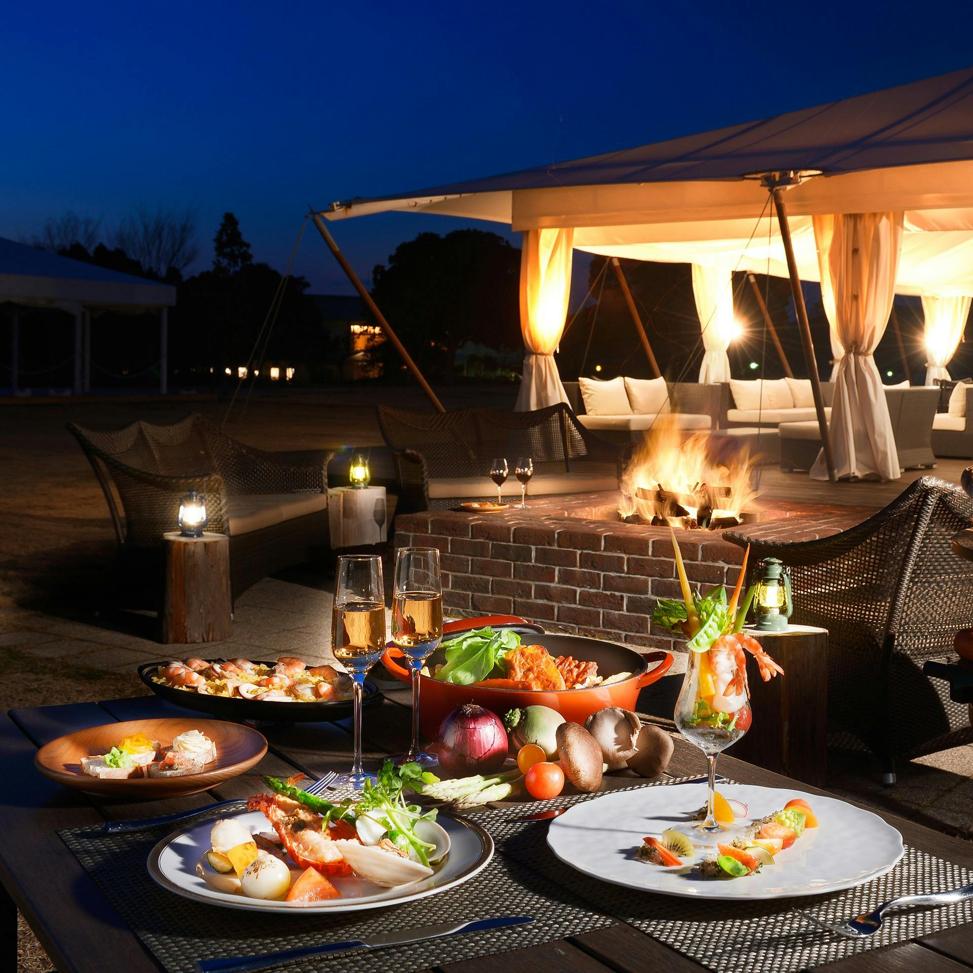 360度パノラマの自然を望むアウトドアダイニング。夜は沈みゆく夕日や満天の星空を眺めながら、朝は太陽の光を感じながら、NEMUならでは贅沢なお食事をお愉しみいただけます。