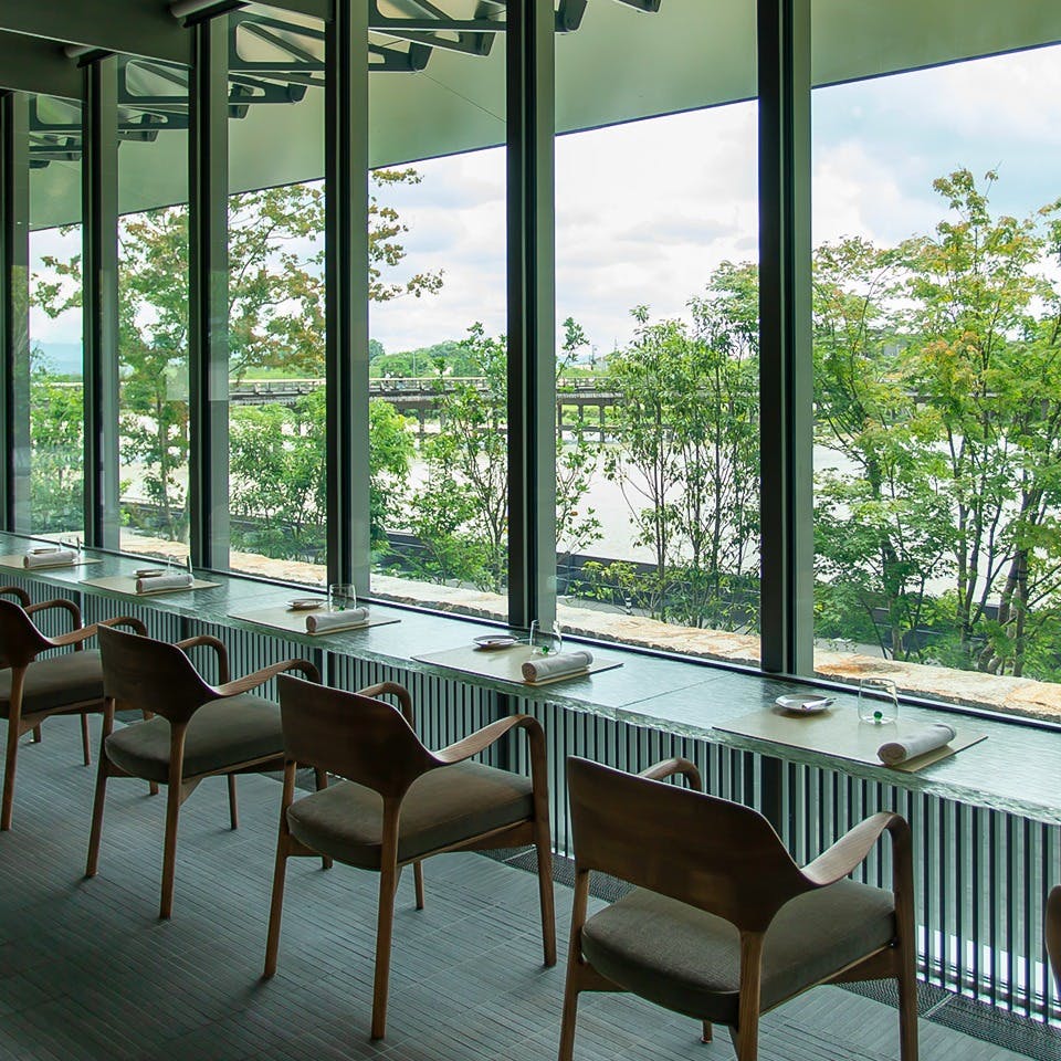 店内には、目の前に広がる渡月橋から嵐山までの景色を満喫できる “特等席” カウンターシートのほか、ゆったりとグループでもご利用いただけるテーブル席をご用意。テーブル席は、ご要望に応じて16名様まで向い合せにお座りいただけますので、グループでご利用の場合はお気軽にお問 合せください。ガラス張りの店内は、大きな窓から差し込む光が明るく照らし、ゆったりとした時が流れる開放的な空間が広がっております。四季折々・刻一刻と移ろう嵐山の風情を楽しみながら、格別なひと時をお過ごしくださいませ。