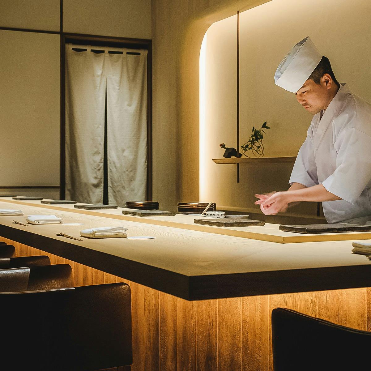 表参道駅から徒歩7分のロケーション。緑豊かなテラスを過ぎるとバーカウンターを備えたエントランスでお出迎えいたします。いつもよりちょっとお洒落に、いつもよりちょっと贅沢を感じて頂ける、少しハードルの高い鮨を心置きなく堪能できる“ちょっといい”体験をご用意しております。料理の特徴は、つまみと握りを交互に提供するスタイルで、最後の一品まで飽きさせない趣向をこらした献立となっております。