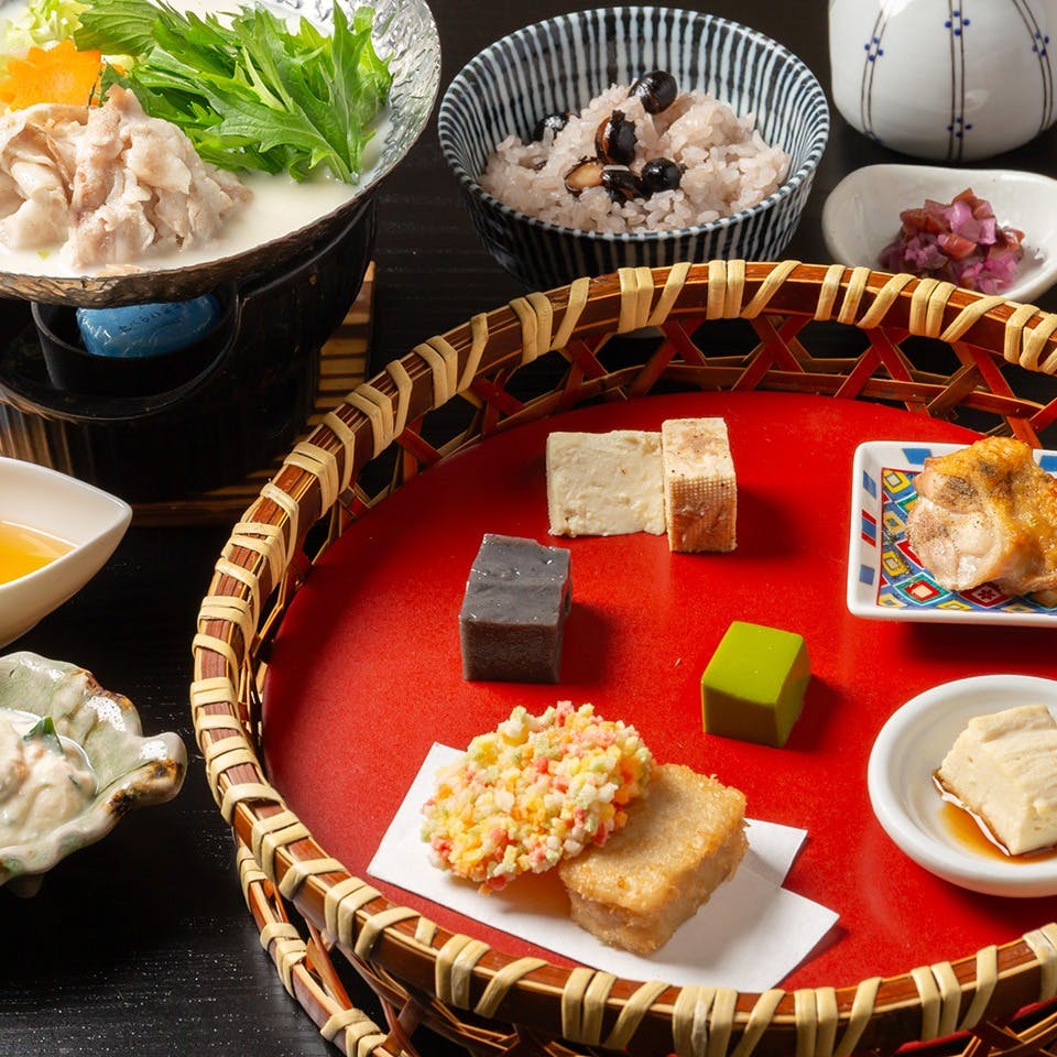 京都の清らかな水が育んだ豆腐をメインに、京食材を使用したさまざまな逸品をお届けします。京野菜と四季折々の美味を使用したおばんざいは、豆八ならではのひねりも効かせて、ほかでは出合えない味を実現いたします。ぜひご賞味ください。