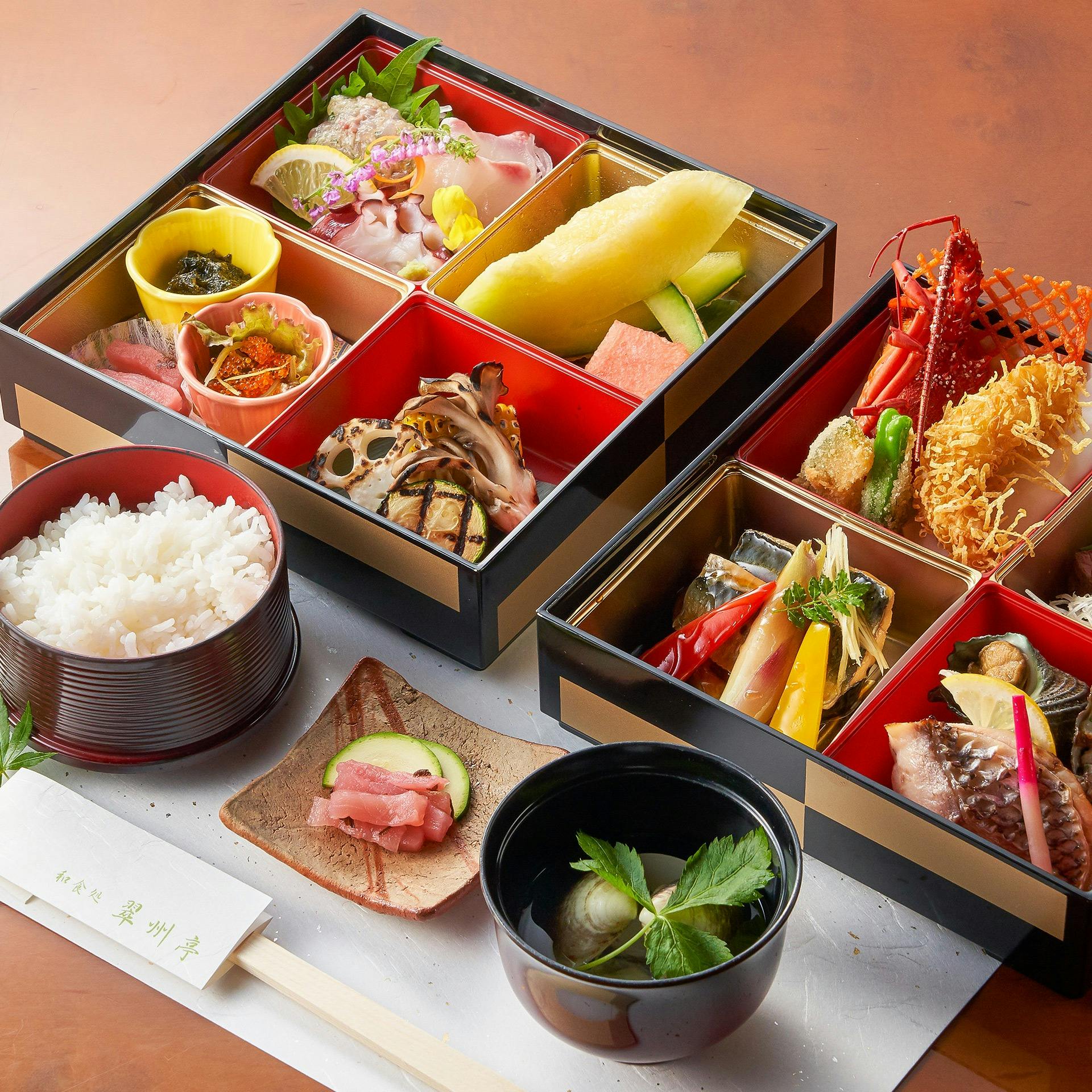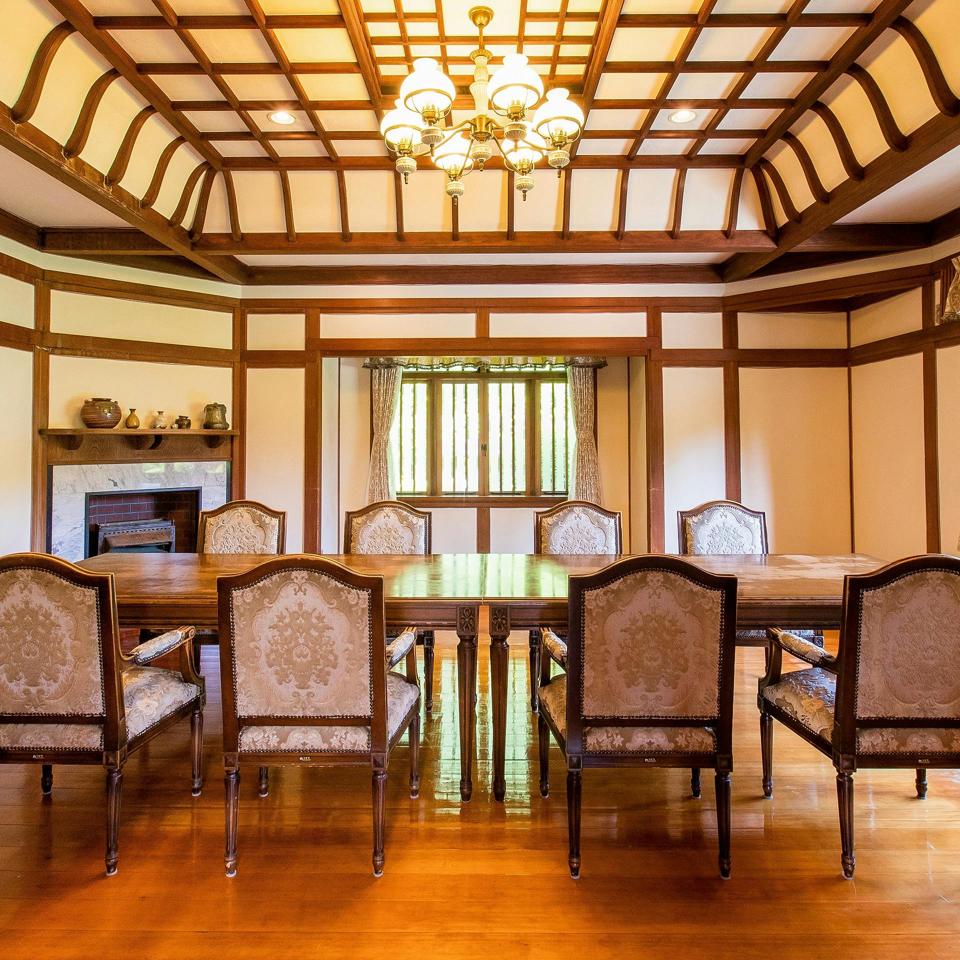 「和食処 翠州亭」は、旧スイス大使館(国の登録有形文化財)をそのまま移設した、格調高い和風建築。枯山水の庭園に臨む落ち着いた店内では、外房の地魚や地元の野菜をふんだんに使った、季節の会席料理をお楽しみいただけます。
