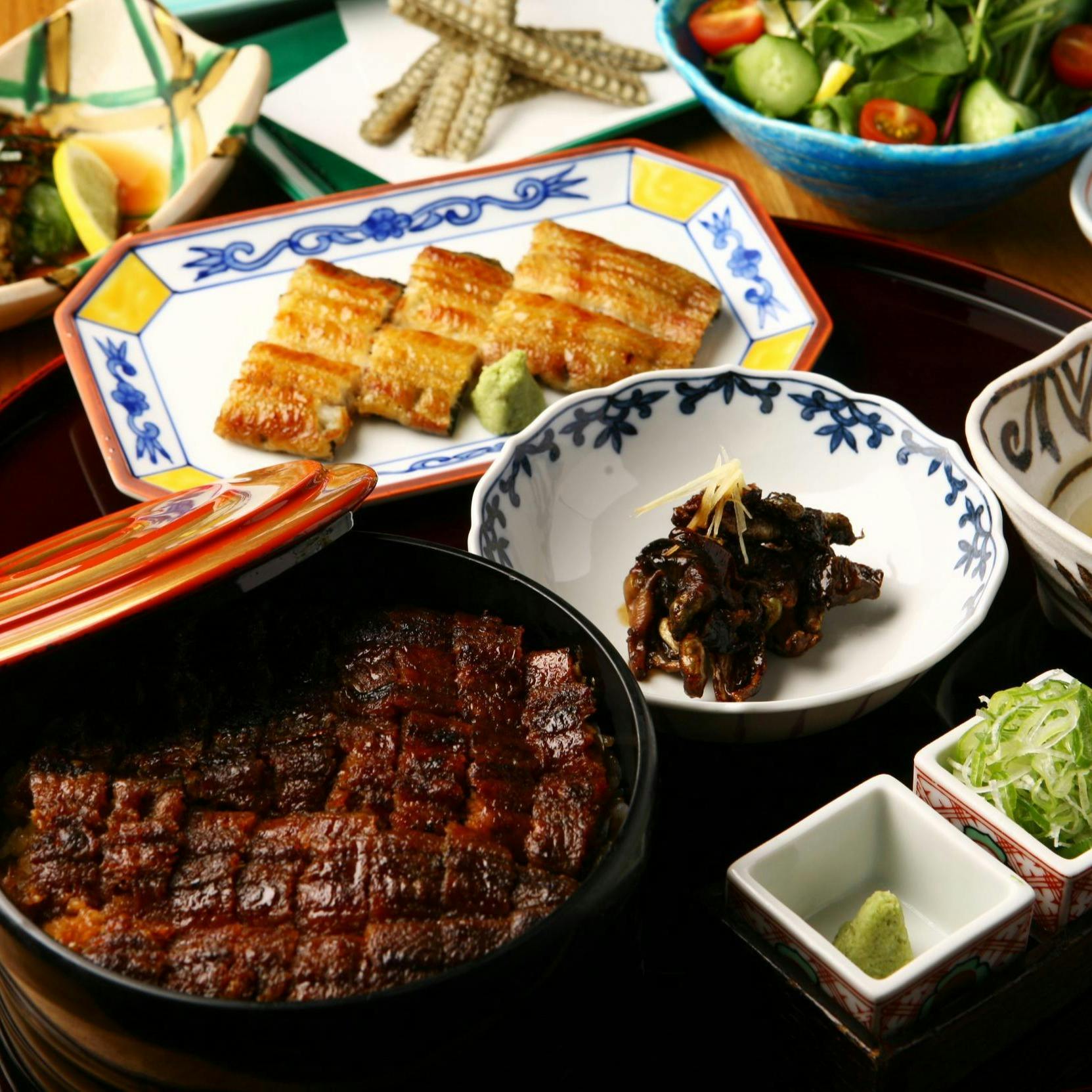 備長炭で焼き上げるひつまぶし。日本庭園を眺めながら待つのも楽しいひと時です。お子さまと家族みんなにうれしいご馳走メニューも豊富に取りそろえております。個室から30名様までのお座敷あり。法事、慶弔等では「まぶし会席」が人気です。