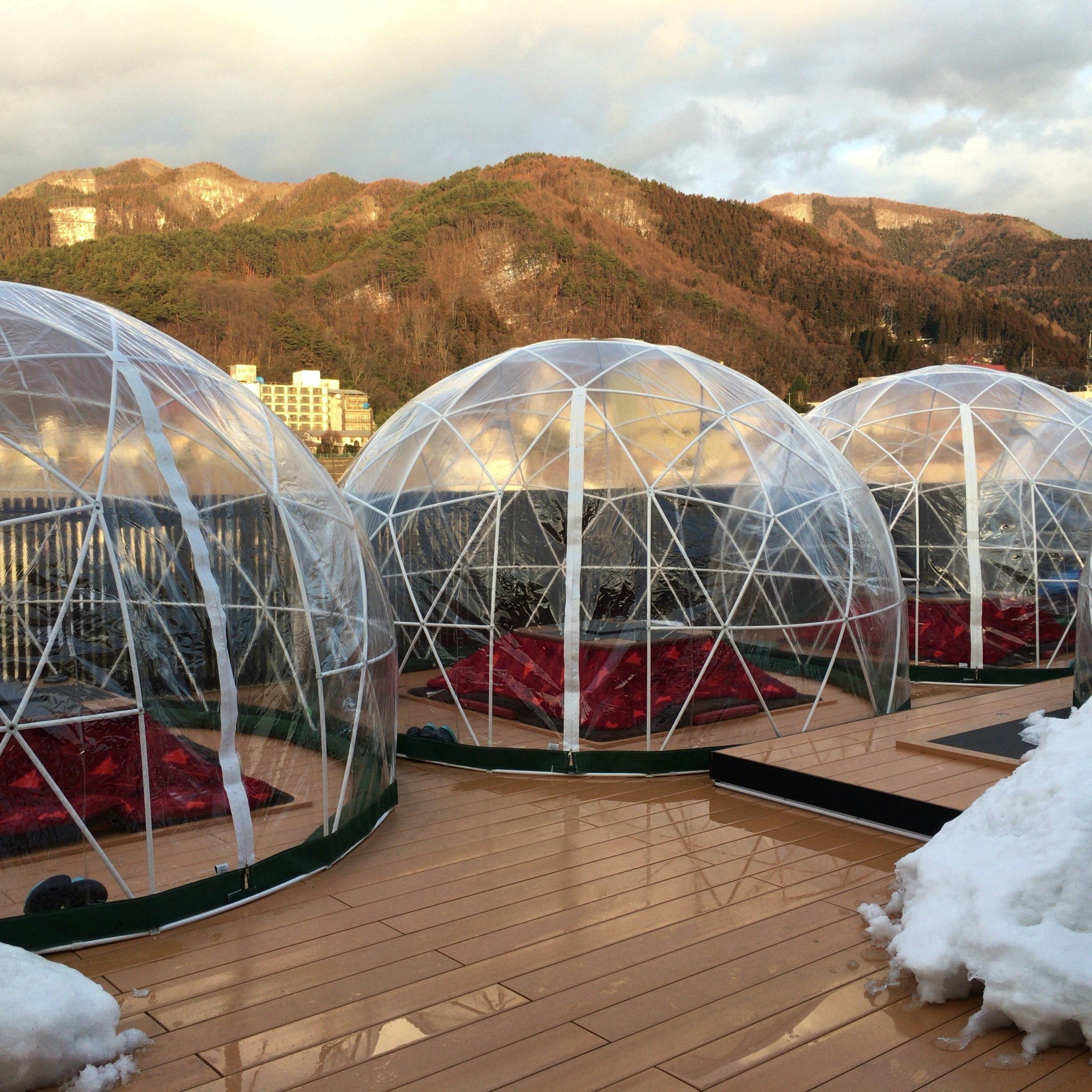 あぶらや燈千の屋上8階にて、ルーフトップバーがオープン。「雪月花」の由来通り、情緒豊かな日本の季節を葛飾北斎の浮世絵とともにご堪能いただけます。季節に合わせて、ルーフトップバーも姿を変えます。冬から春は、かまくらと掘りごたつで、雪景色。初夏から晩秋は、野点傘の下、日本の情景を味わい畳でお寛ぎいただけます。季節によって、趣向を凝らした「おもてなし」「風情」を楽しんでいただきたいと願っております。