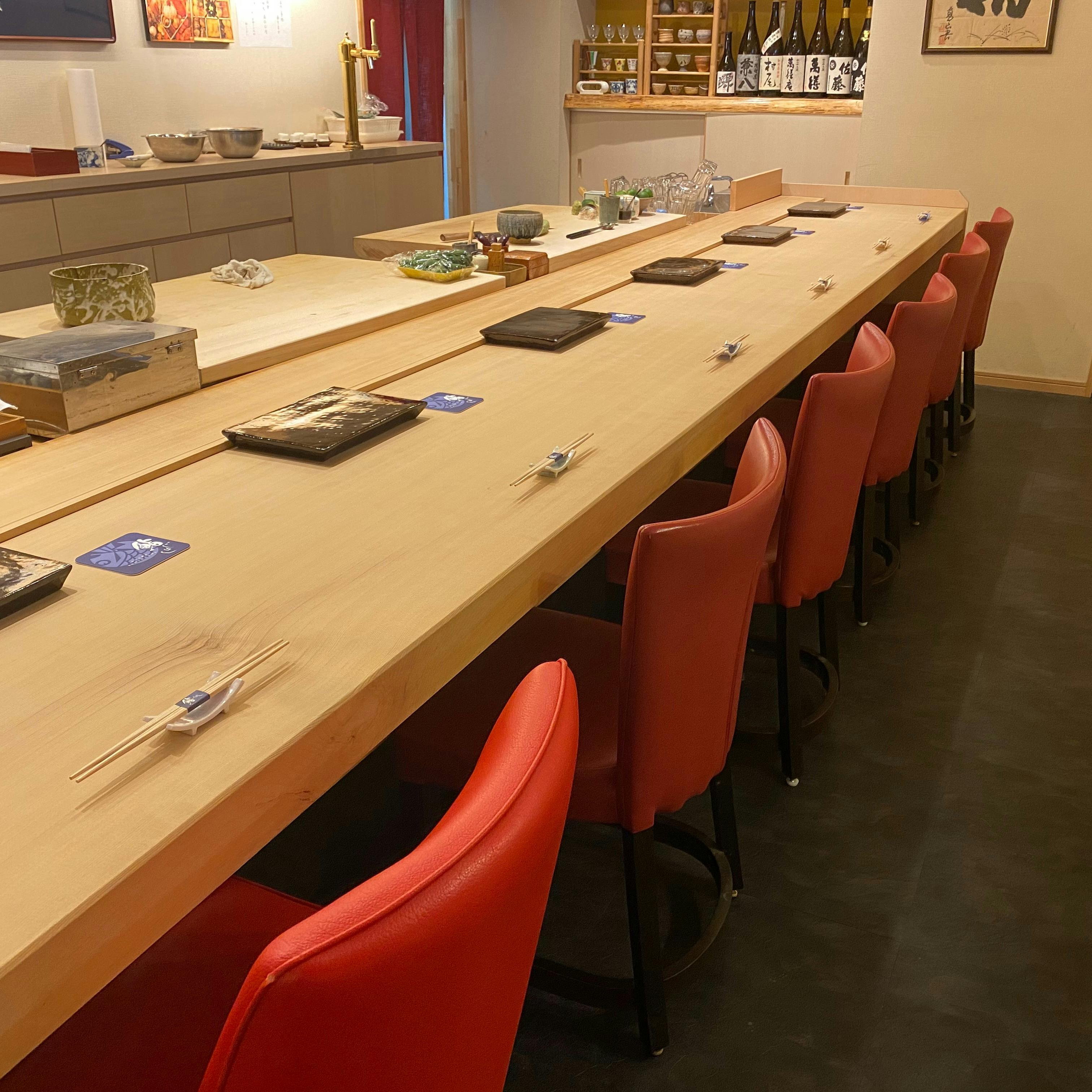 高級感がありながらも木のぬくもりを感じるこだわりの店内で、店主が目利きして仕入れた旬の食材をお愉しみいただけます。食材を活かす調理方法に拘り、同じ魚でも脂の乗り方などを見て、調理の方法を変える拘りです。常に食材を活かす作り方、握り方を考えておりますので、旬の食材を最高の状態でご提供しております。カウンター席で店主との会話を楽しみながら、自慢の逸品もお愉しみください。