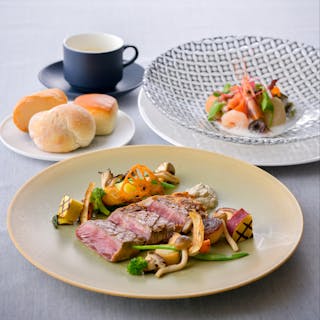 メインディッシュは洋食・和食の豊富なメニューからお選びいただけます。デザートはお好きなものを目の前で取り分けるワゴンサービス。季節感を大切にしたプリフィクスコースをお楽しみください。