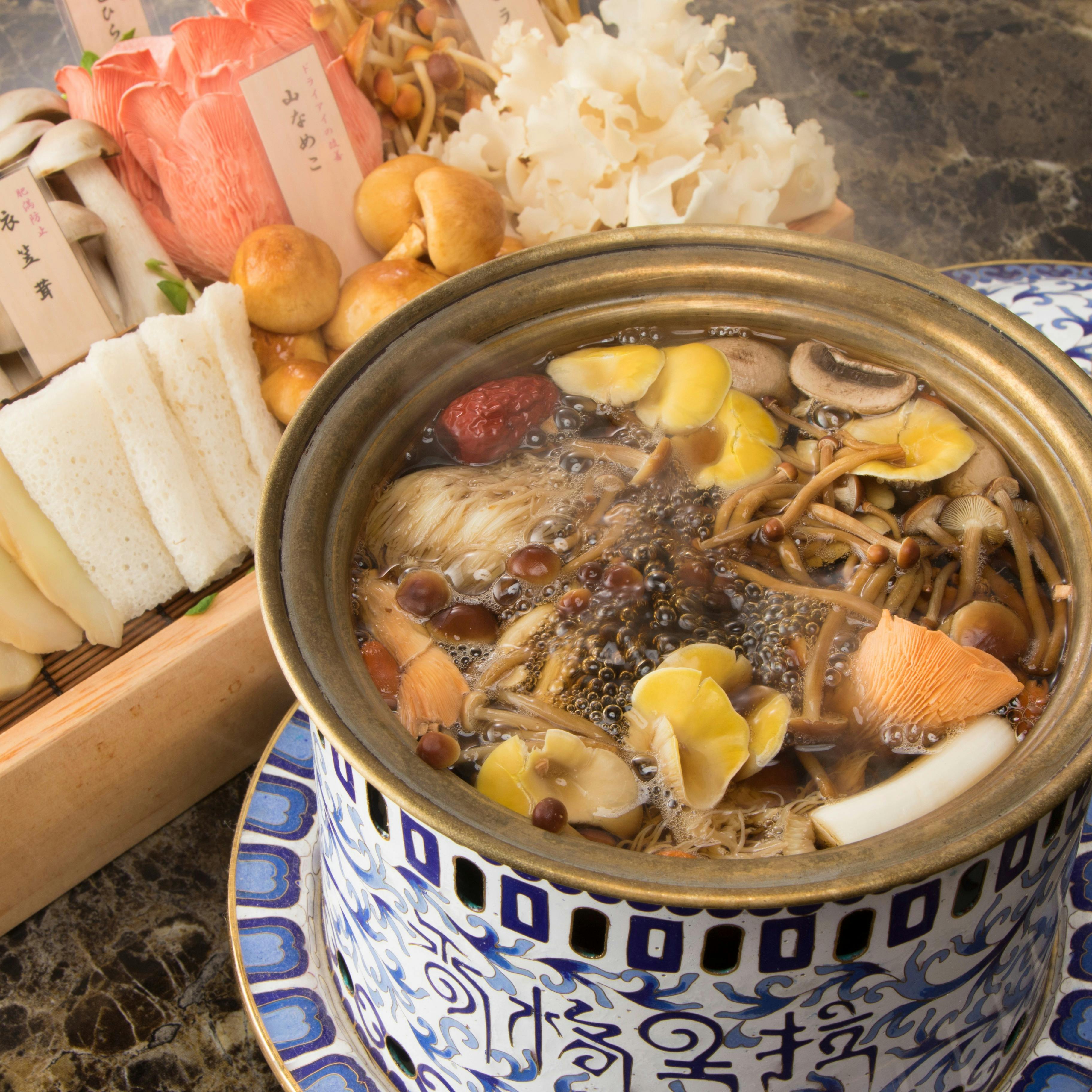 『美味』『肌が美しくなる』『デトックス』と3拍子揃った女性に大人気のきのこしゃぶしゃぶ。自慢のきのこと秘伝の手法でじっくりと煮込んだブラックスープにはビタミン、ミネラル、カルシウム、アミノ酸などを豊富に含み女性の味方となる事間違いなし。スープを味わう、キノコや野菜、お肉をしゃぶしゃぶスタイルで頂く、キノコ麺で食すなど一度で何味もお愉しみ頂け、徐々に素材の旨みがしみだしたスープは更に魅惑の味に変わっていきます。