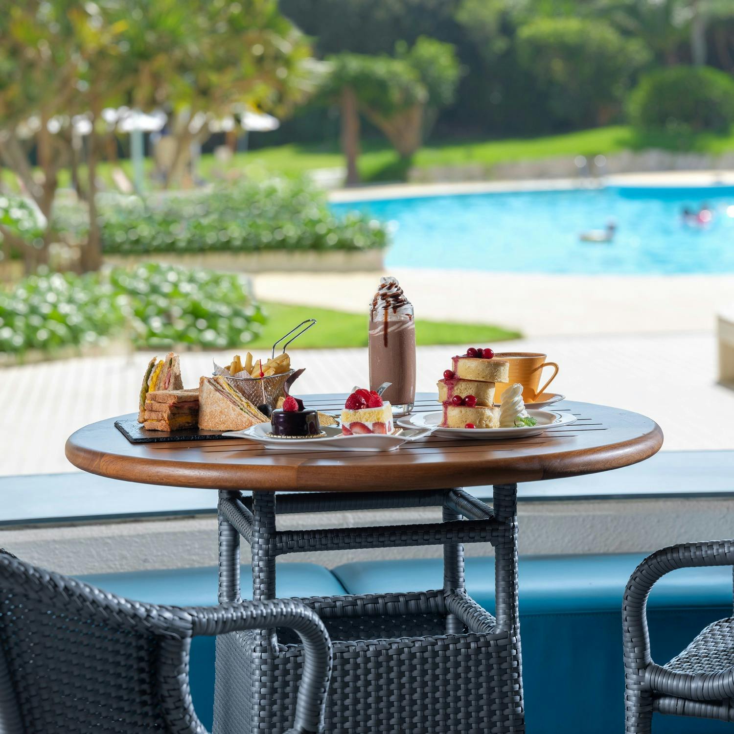 恩納村の景勝地万座毛を望む、ANAインターコンチネンタル万座ビーチリゾート内にございます。海からの爽やかな風を感じ、リゾート感溢れるガーデンプールを眺めながら、吹き抜けの開放的なホテルのラウンジで特別な時間をお過ごしください。