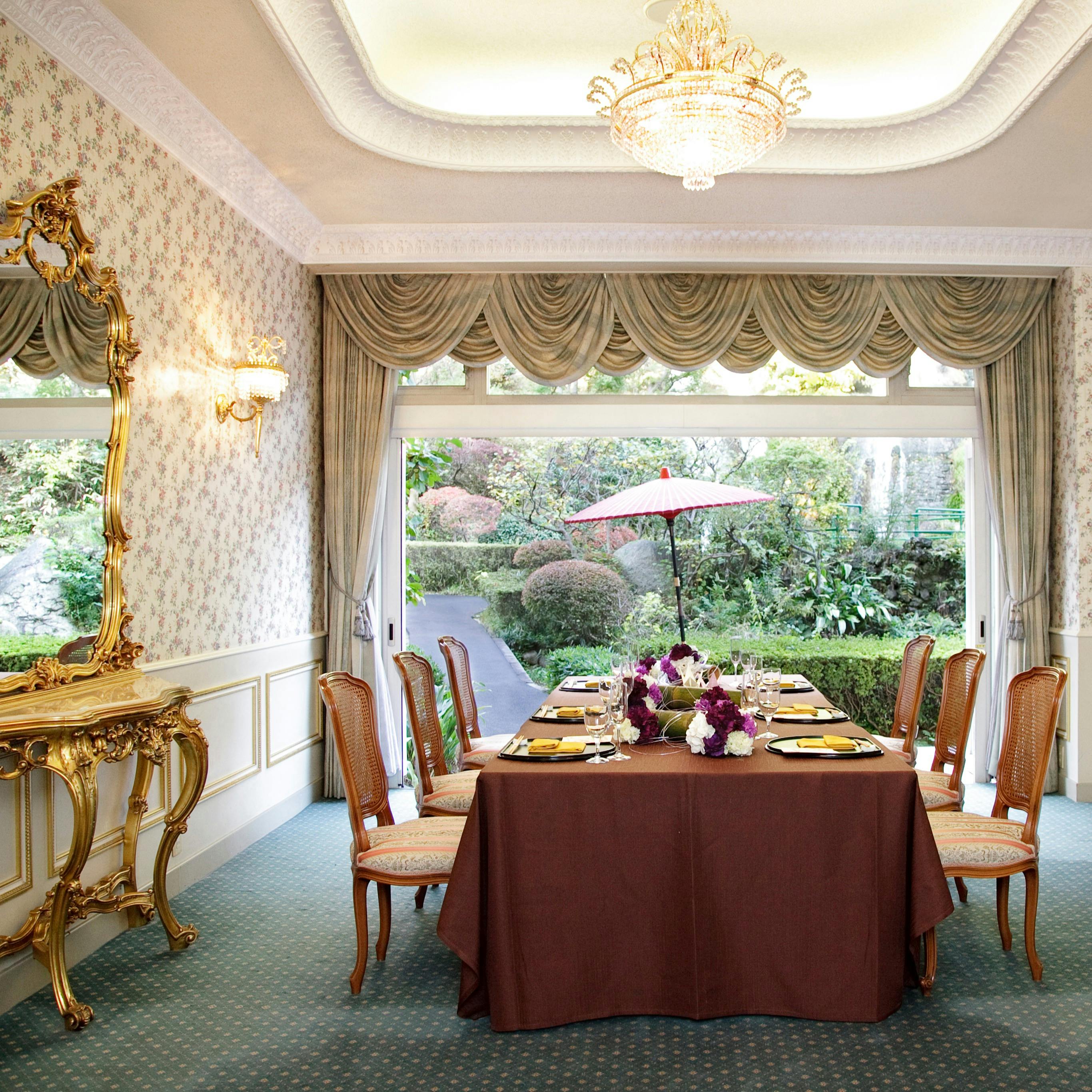 八王子日本閣では優美華麗なロココ様式をあしらい、プチ・トリアノンに迷い込んだかと錯覚させるほど同宮殿の様式美を再現しています。また、和の魅力を存分に味わっていただける五重塔、御殿山神殿や自然の景観をそのまま活かした日本庭園など、四季折々の豊かな美しさをお楽しみいただけます。お料理は手作りを大事に、健康で安全なものを使い、出来うる限り土地のものにこだわっています。地元の農家の方に会い、河岸や市場へと自ら赴き、美味しい食材で「自然に笑顔になる」ものをご提供いたします。滝と庭園に面したお部屋で、まるで都内にいると思えない自然に囲まれた非日常空間で、最高の思い出をご提供致します。