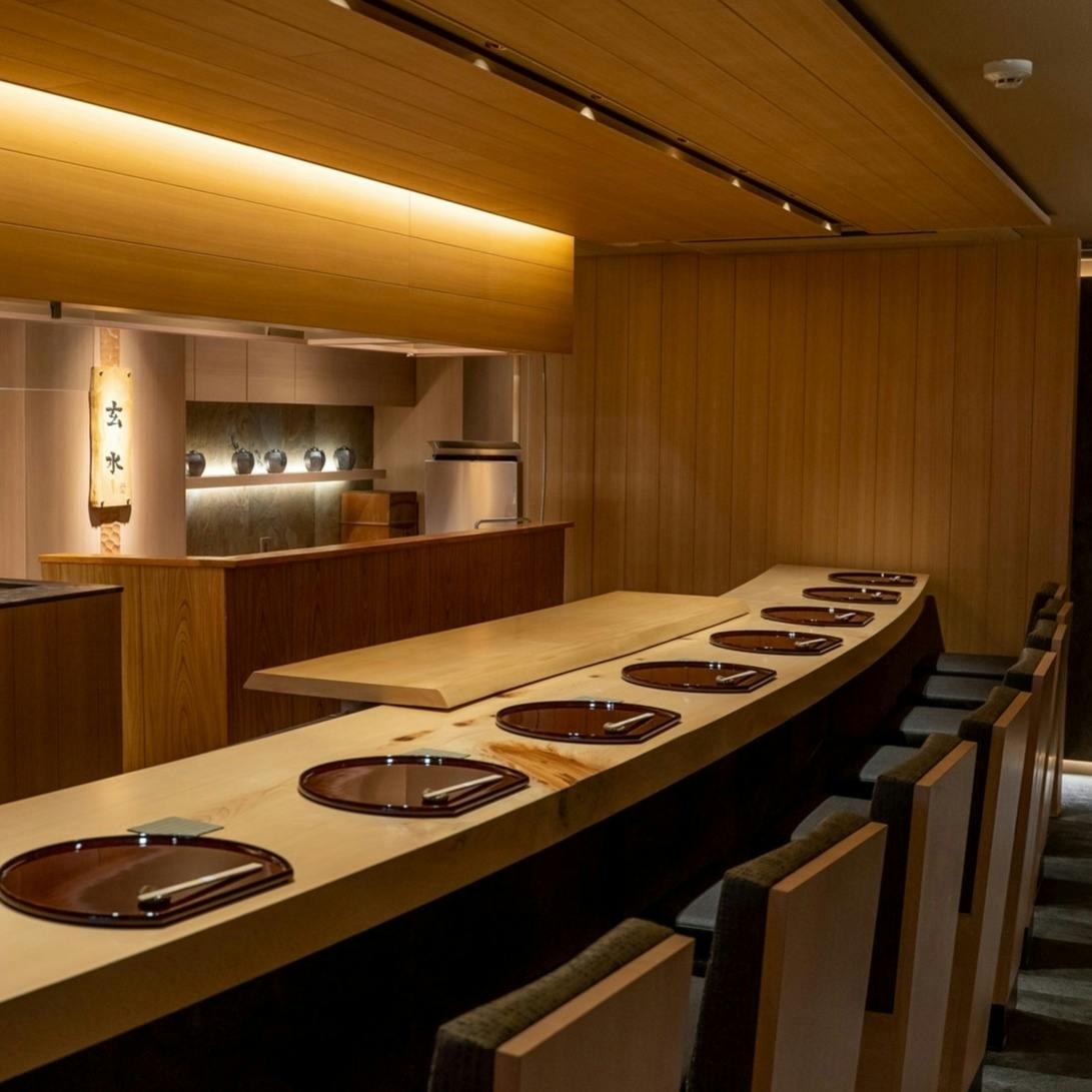栄駅よりほど近い賑わいあるエリアに佇む「古式蕎麦 玄水」。店内に足を踏み入れると、都会の喧騒を感じさせない情緒溢れる大人の空間が広がっています。広く作られたカウンター9席のみの店内は、ライブキッチンスタイルの為、目の前で店主がお作りする調理パフォーマンスも楽しめるのが自慢です。