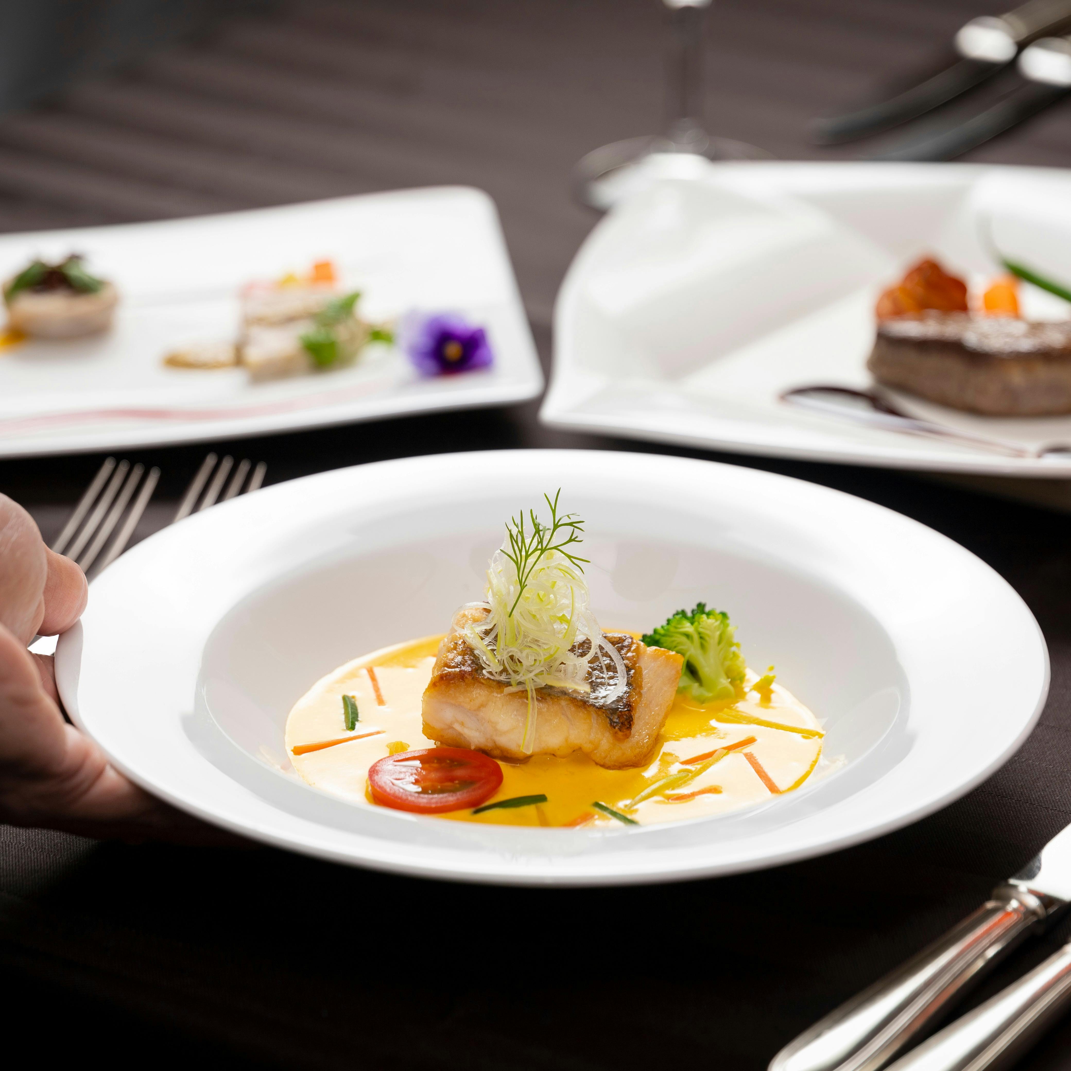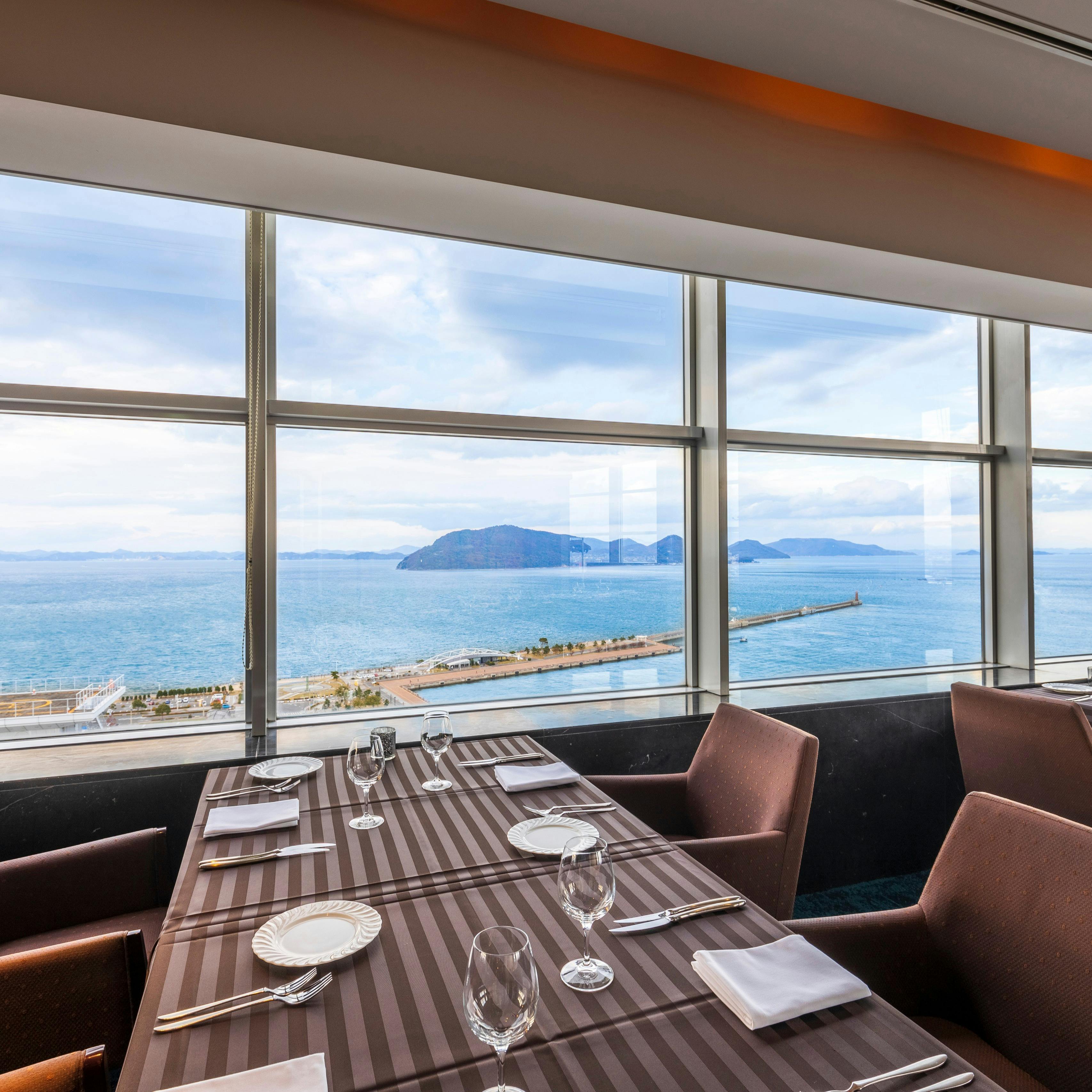 20階からの光に照らされる瀬戸内海の景色や高松市の街並みを望む夜景がご覧いただけるスカイレストラン。地元食材とシェフの技が光る洗練されたフレンチを愉しめます。コースデザートにはフランベの演出もありデートや特別な記念日など大切な思い出のひとときを演出いたします。