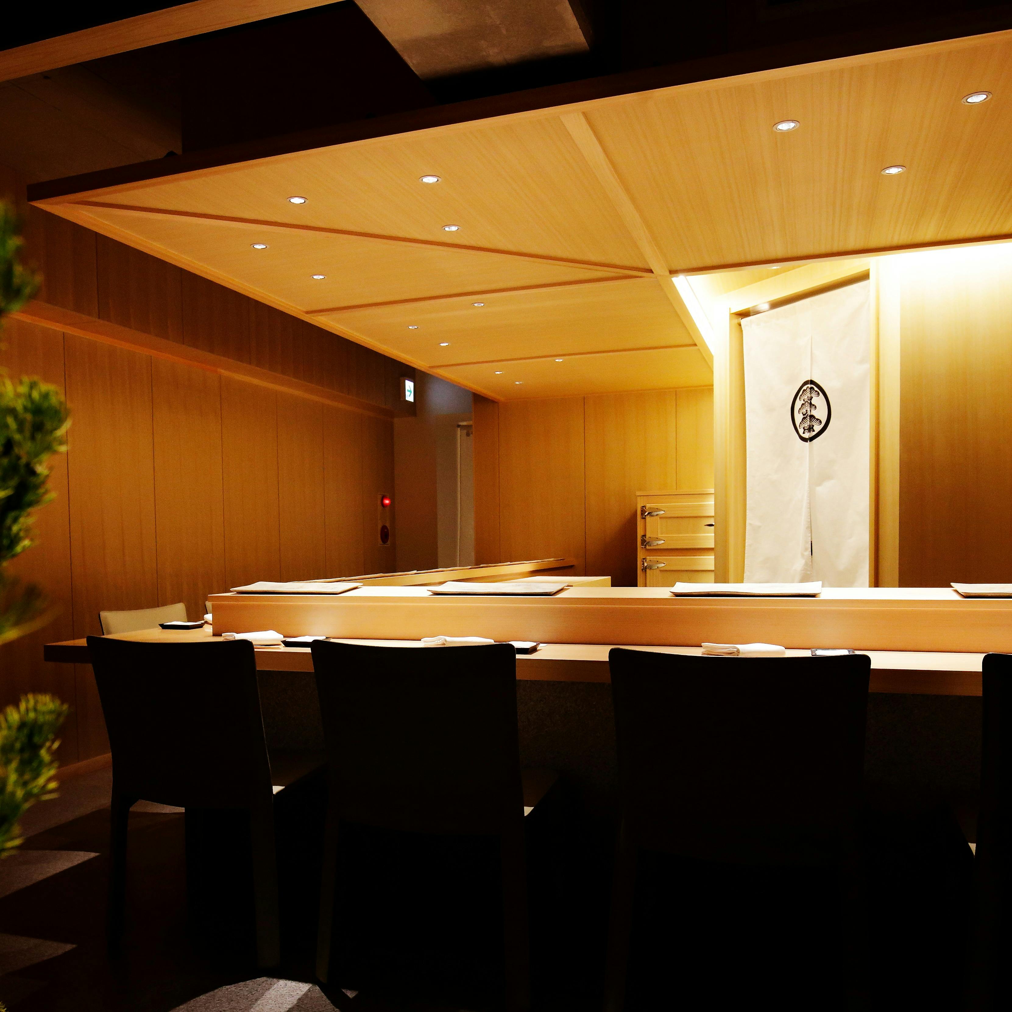 中目黒の静かな住宅街の一画にある、わずか十席の鮨店。きりりとした白暖簾をくぐれば、清々しい無垢材をあしらった空間が広がり、正面の坪庭では松の盆栽の見事な枝ぶりがお迎えいたします。